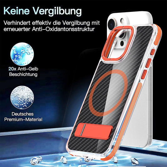 For iPhone 16 15 14 Pro Max Phone Case, Premium Strong Magnetic Carbon Fiber Metal Bracket Acrylic Clear Shockproof Anti-Fall Bumper for Magsafe Non-Yellowing Hard Full