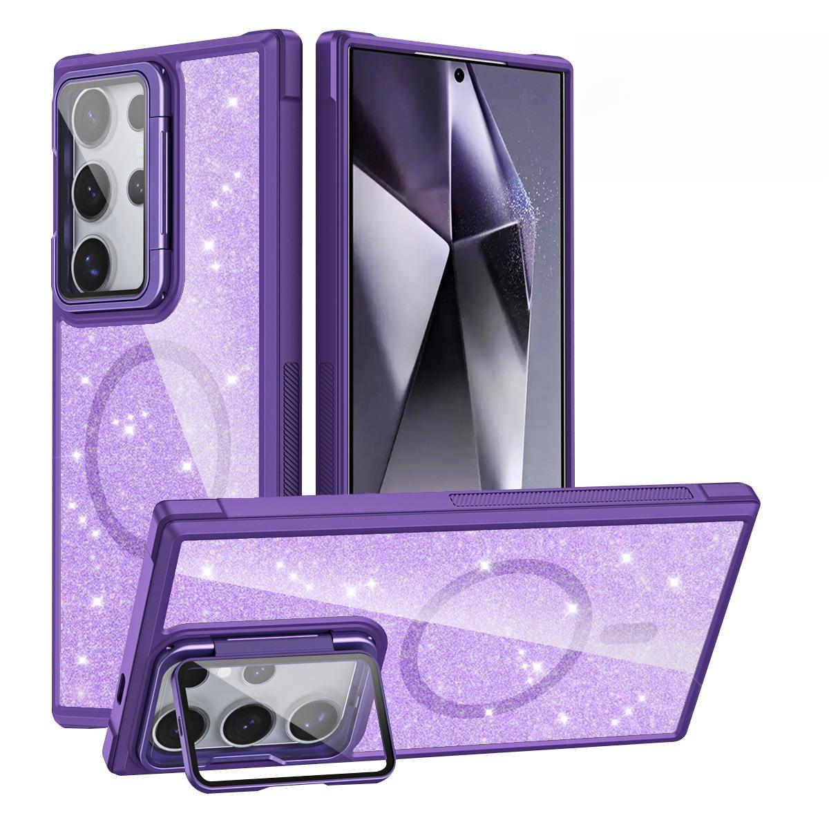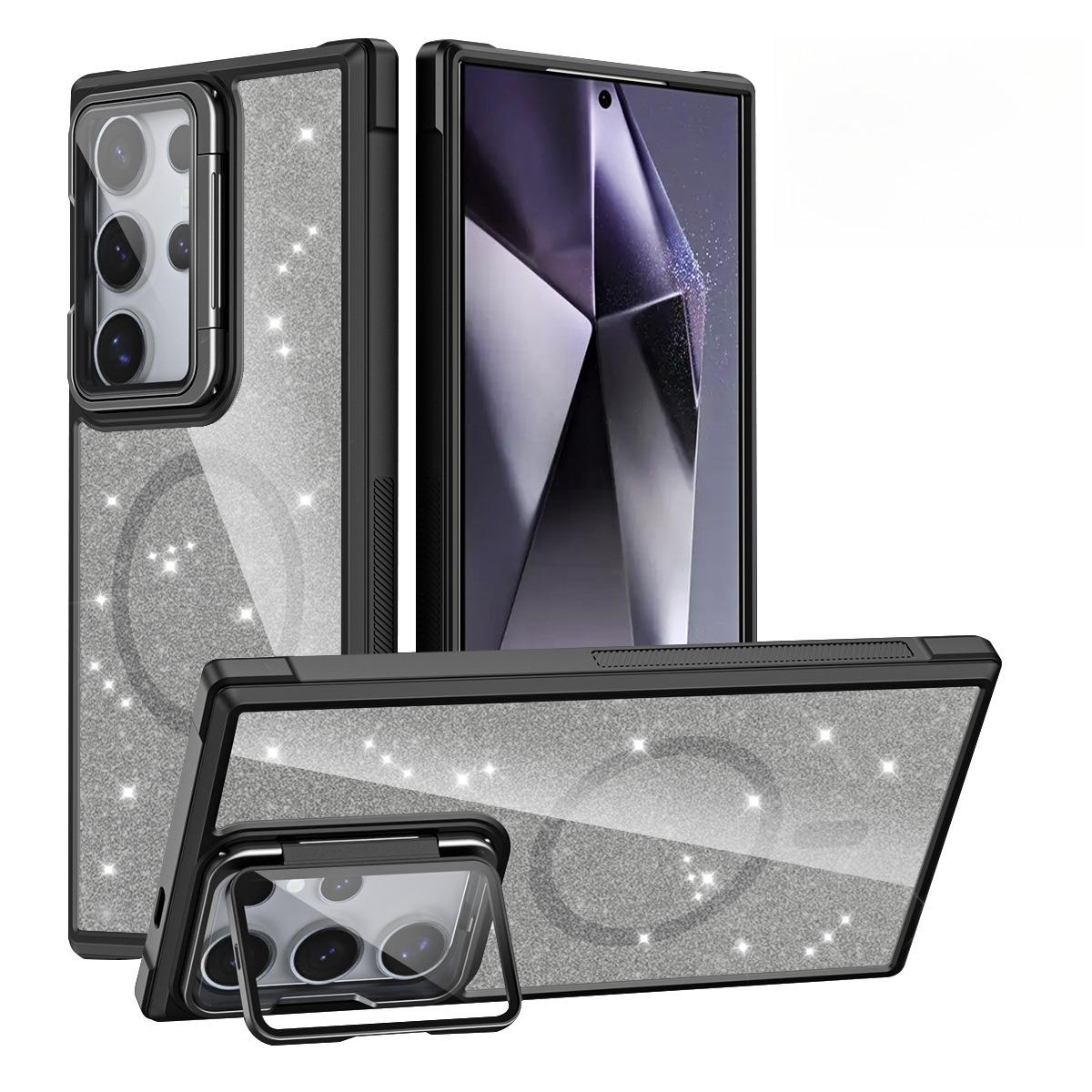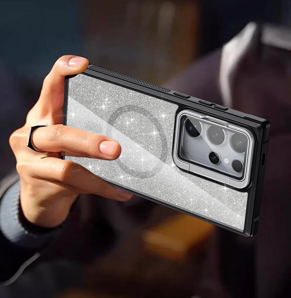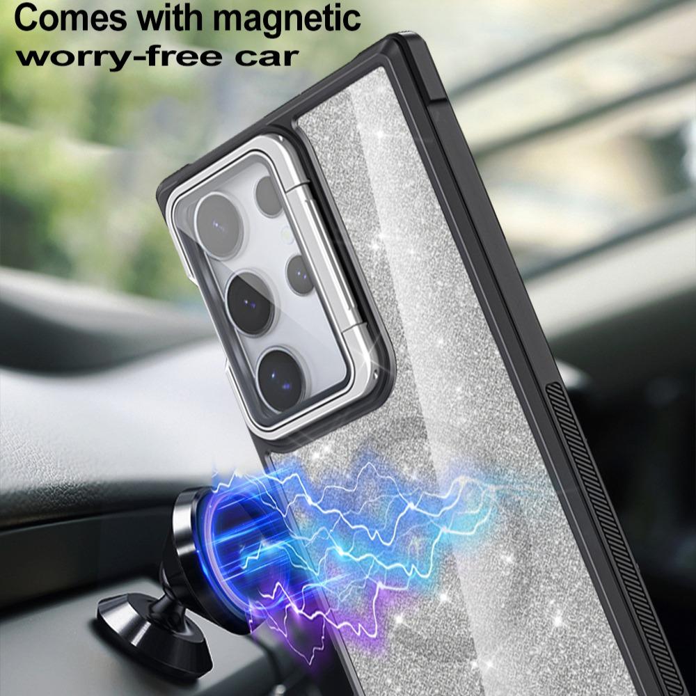 For Samsung S25Ultra S25 S24 S23 S21FE S20FE Strong Magnetic Phone Case, Glass Camera Kickstand Protection, Glitter Clear Acrylic Four Corner Shockproof Bumper Hand Feel Hard Full Cover