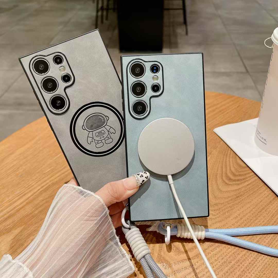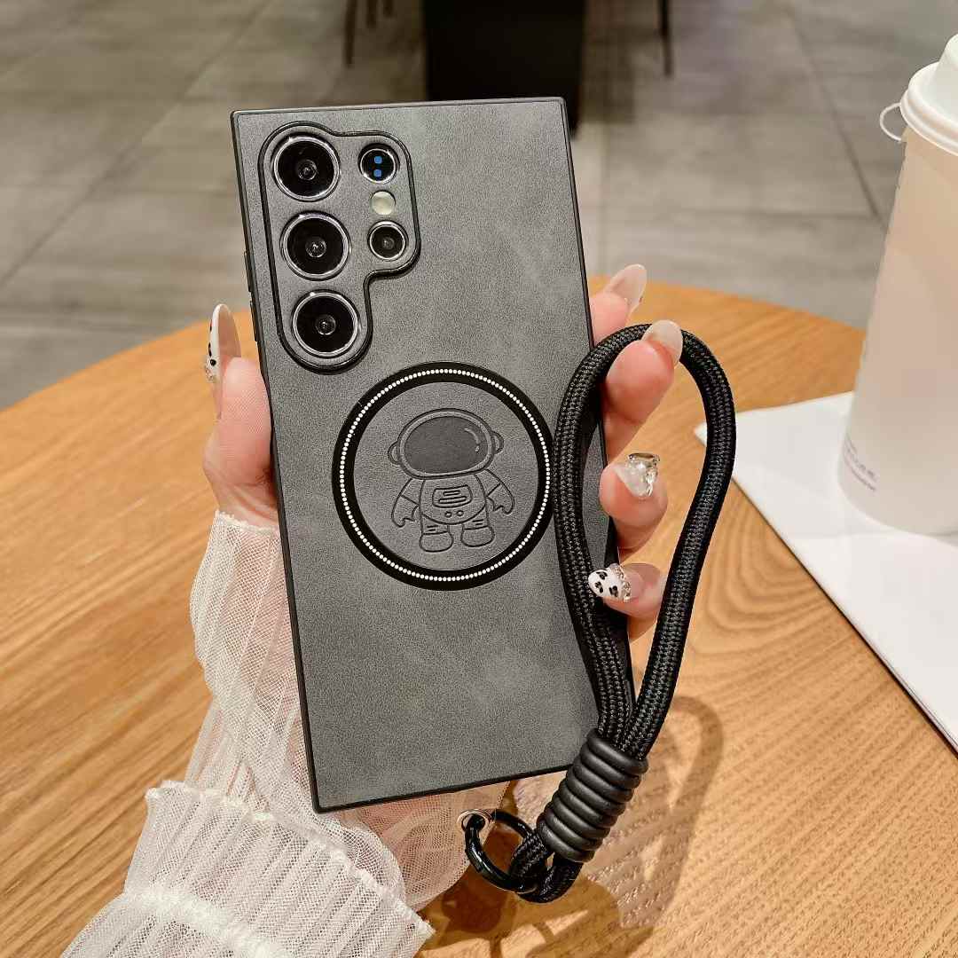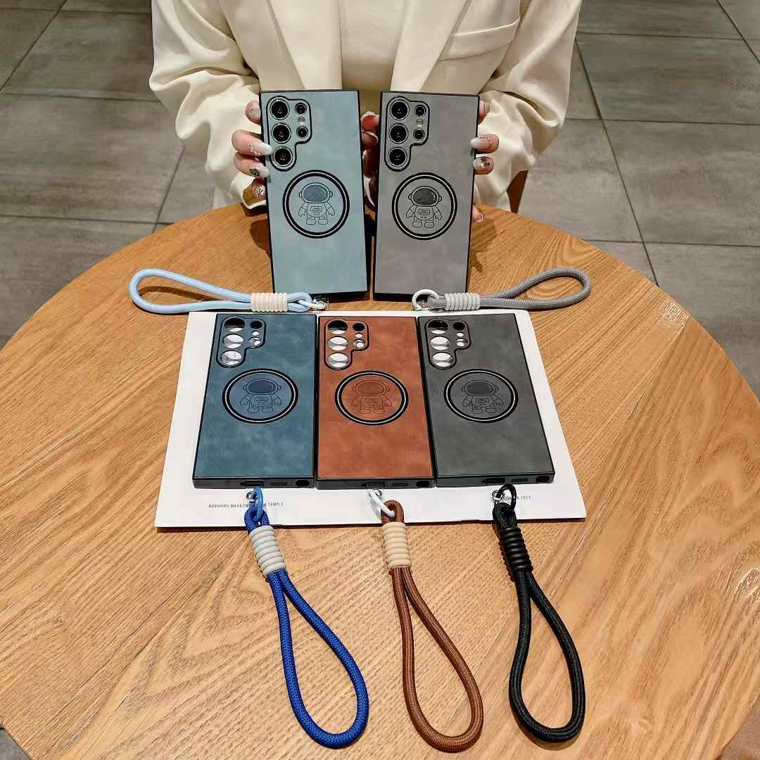 For Samsung S25Ultra S25Edge S24 S23 S22 S21 Note20 Case With Weave Wristband, Astronaut Pattern Matte Suede Leather Magnetic Shockproof Anti-Slip Hard Phone Case