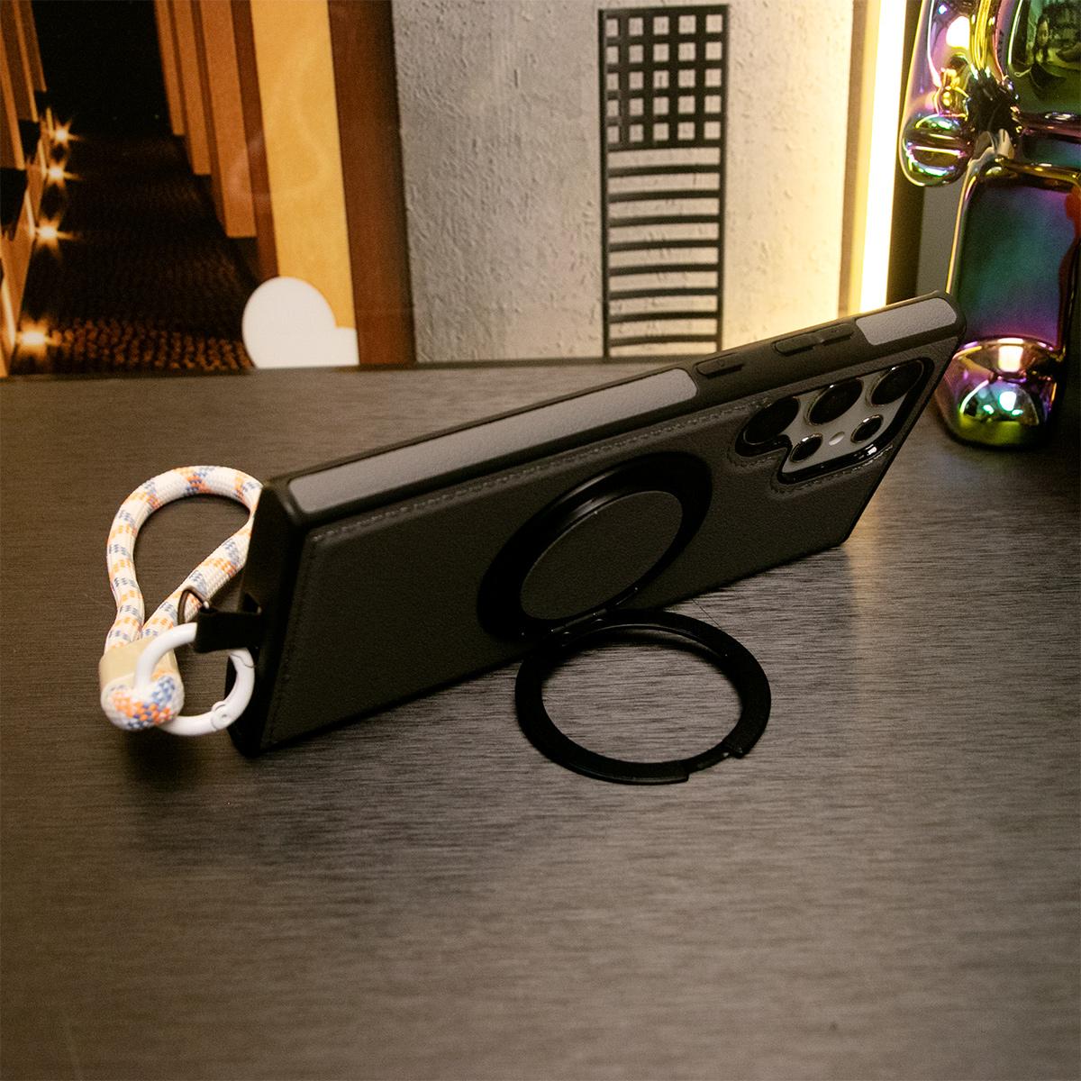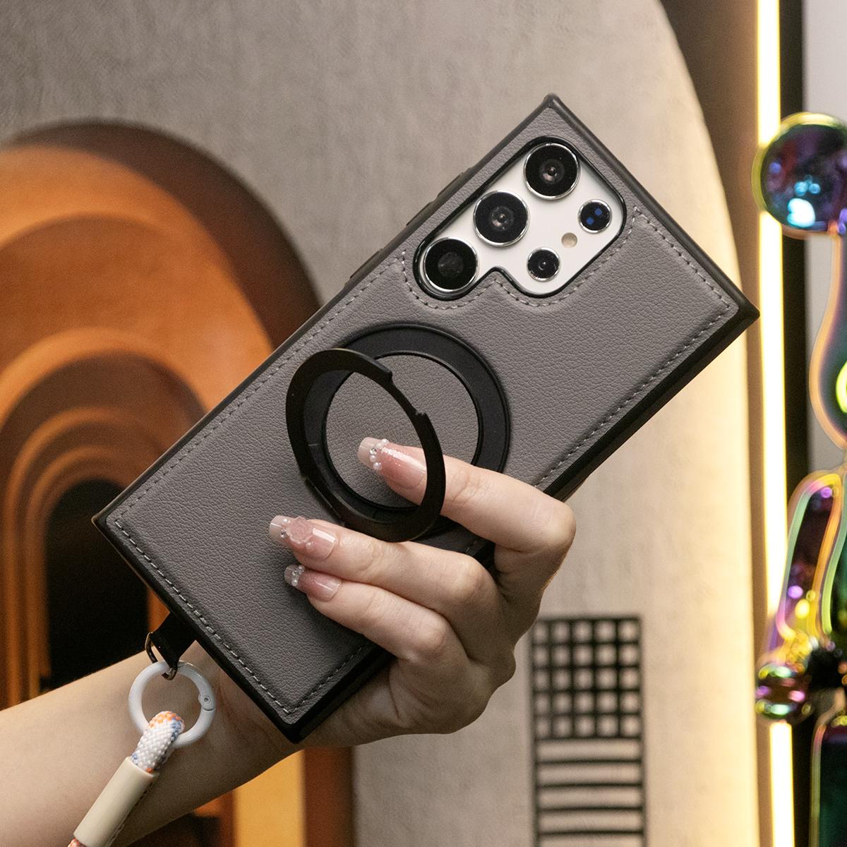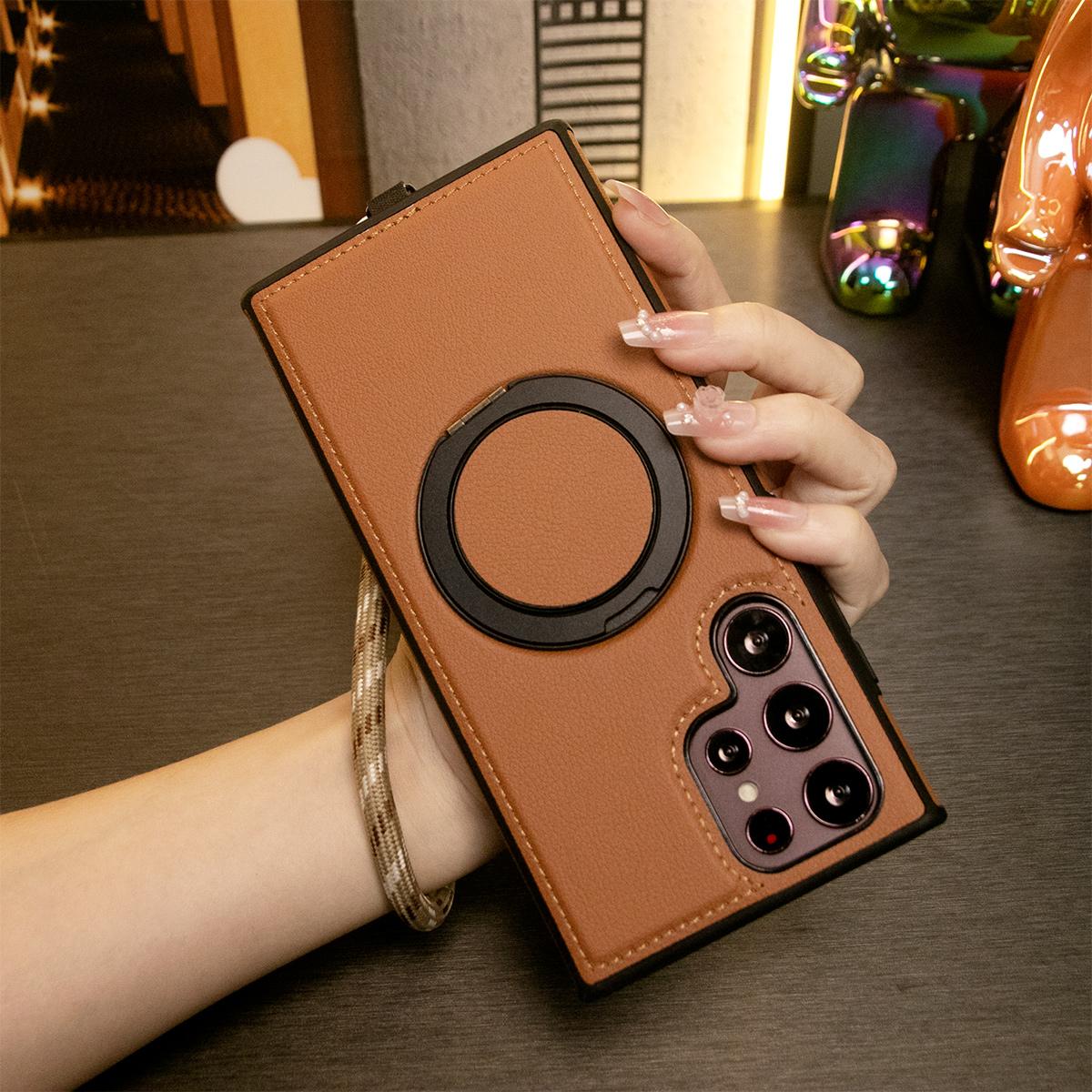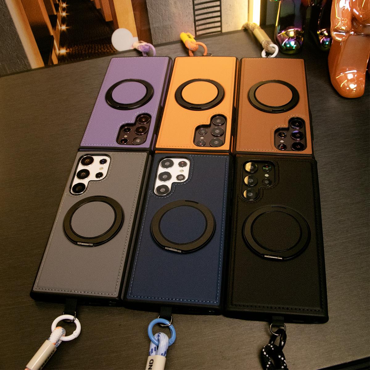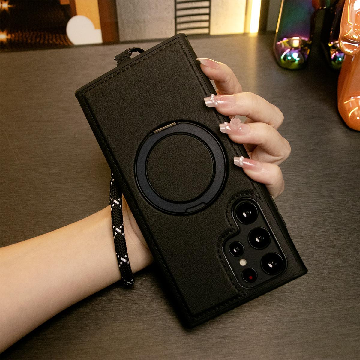 Luxury Full Leather Phone Case With Short Wristband For Magsafe Samsung S24 Ultra S23 S22 Ultra Plus Magnetic Rotate Metal Holder Stand Back Cover