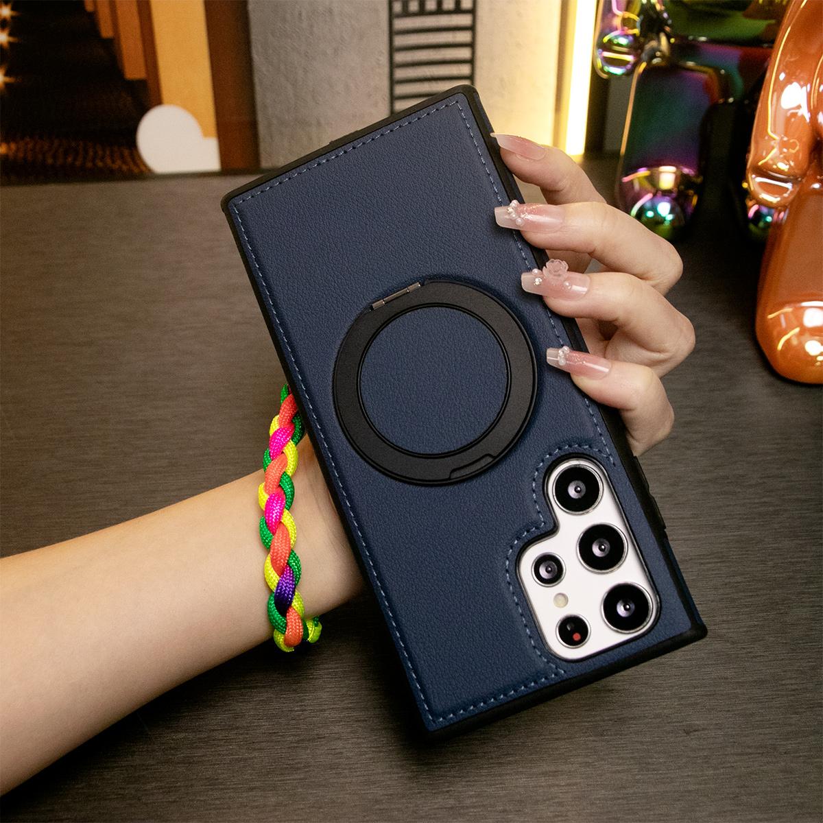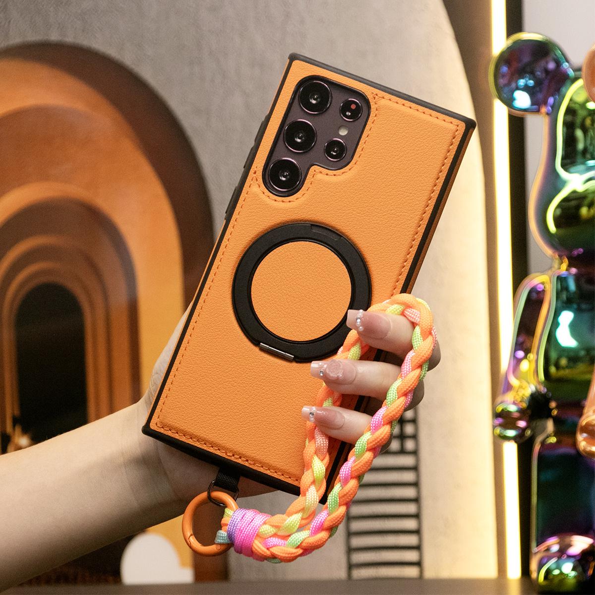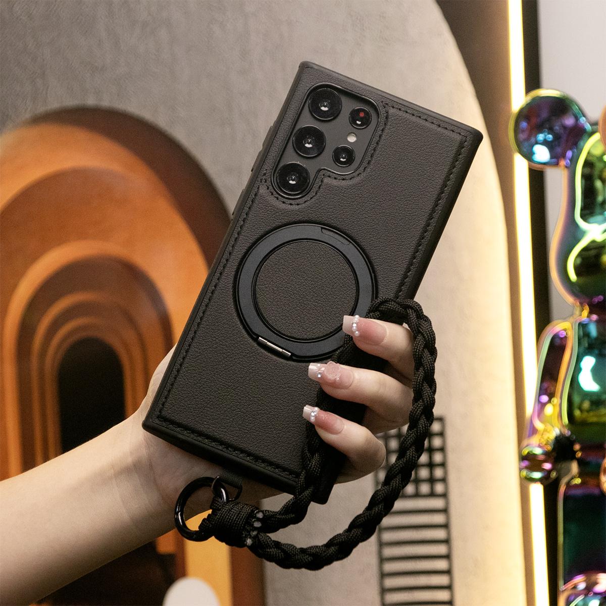Luxury Full Leather Phone Case With Woven Wristband For Magsafe Samsung S24 Ultra S23 S22 Ultra Plus Magnetic Rotate Metal Holder Stand Back Cover