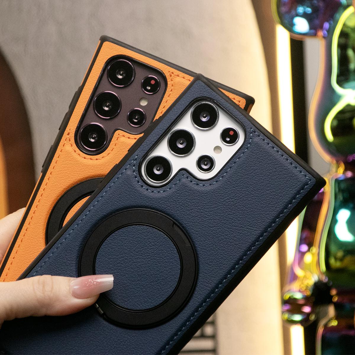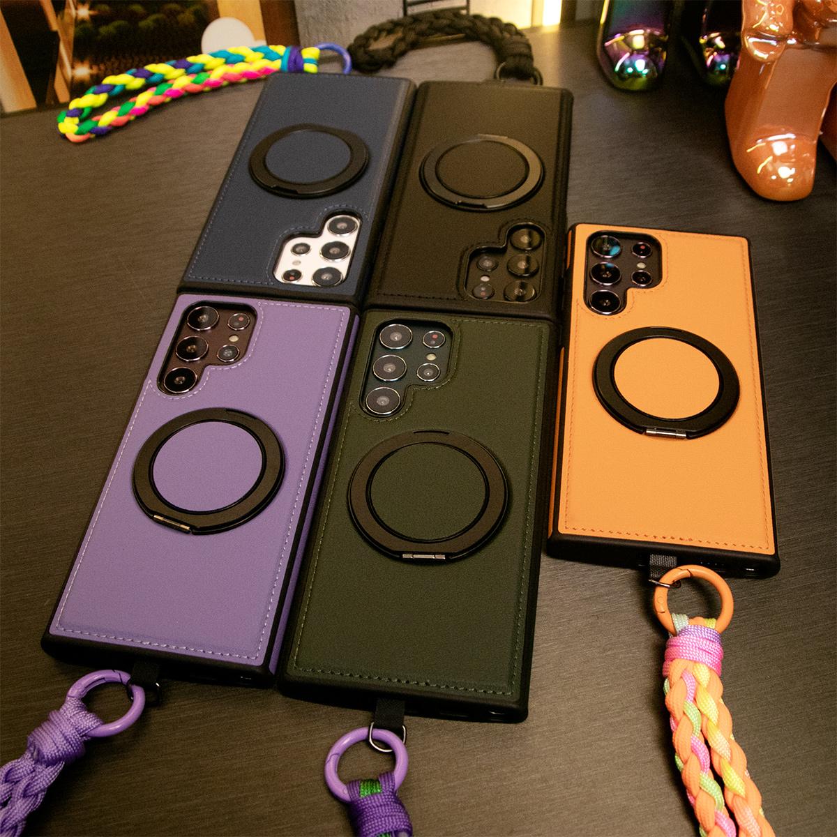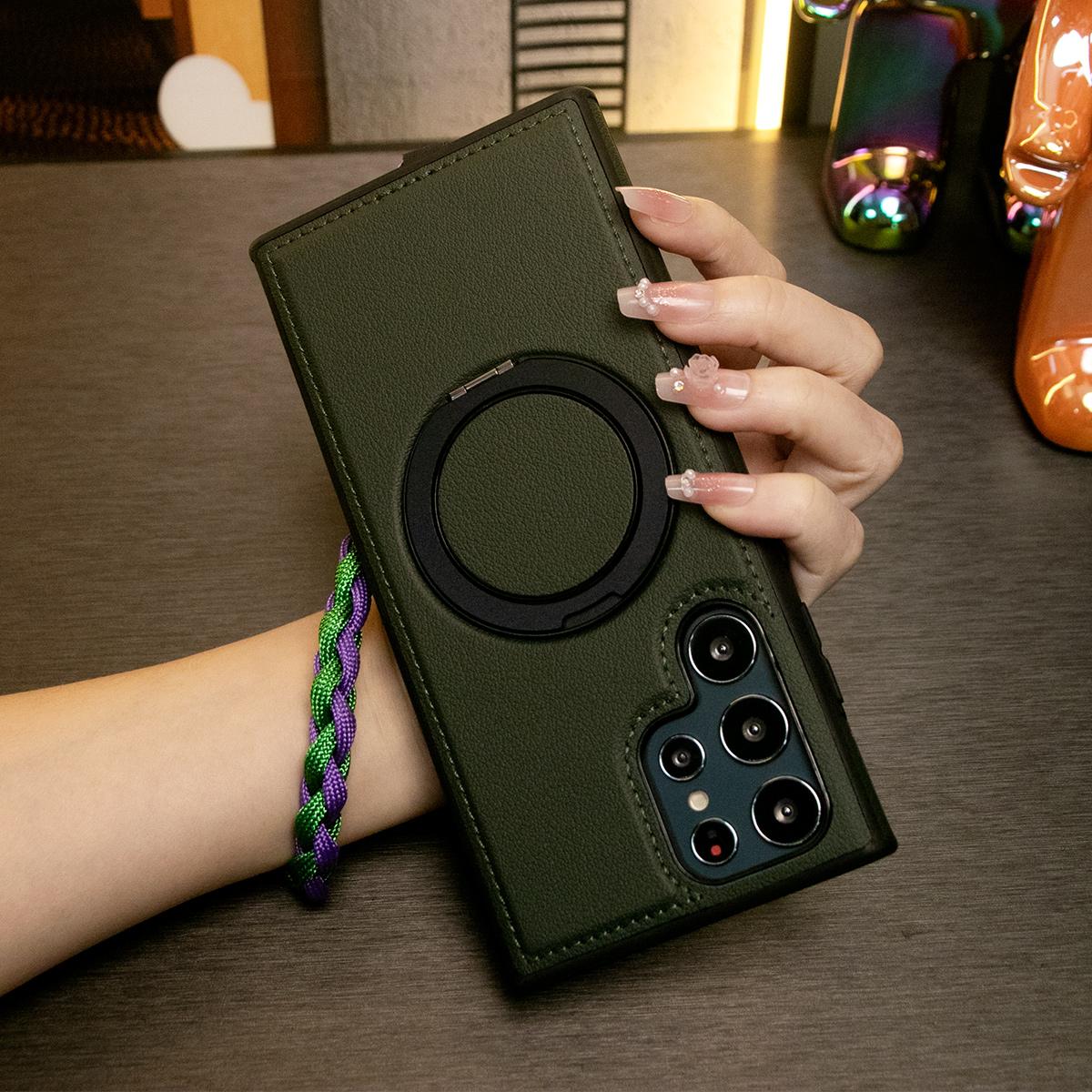 Luxury Full Leather Phone Case With Woven Wristband For Magsafe Samsung S24 Ultra S23 S22 Ultra Plus Magnetic Rotate Metal Holder Stand Back Cover