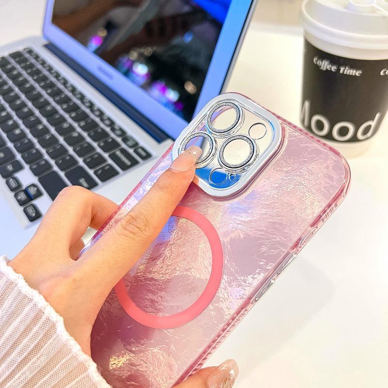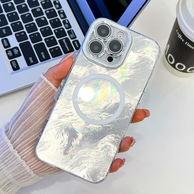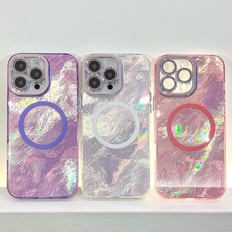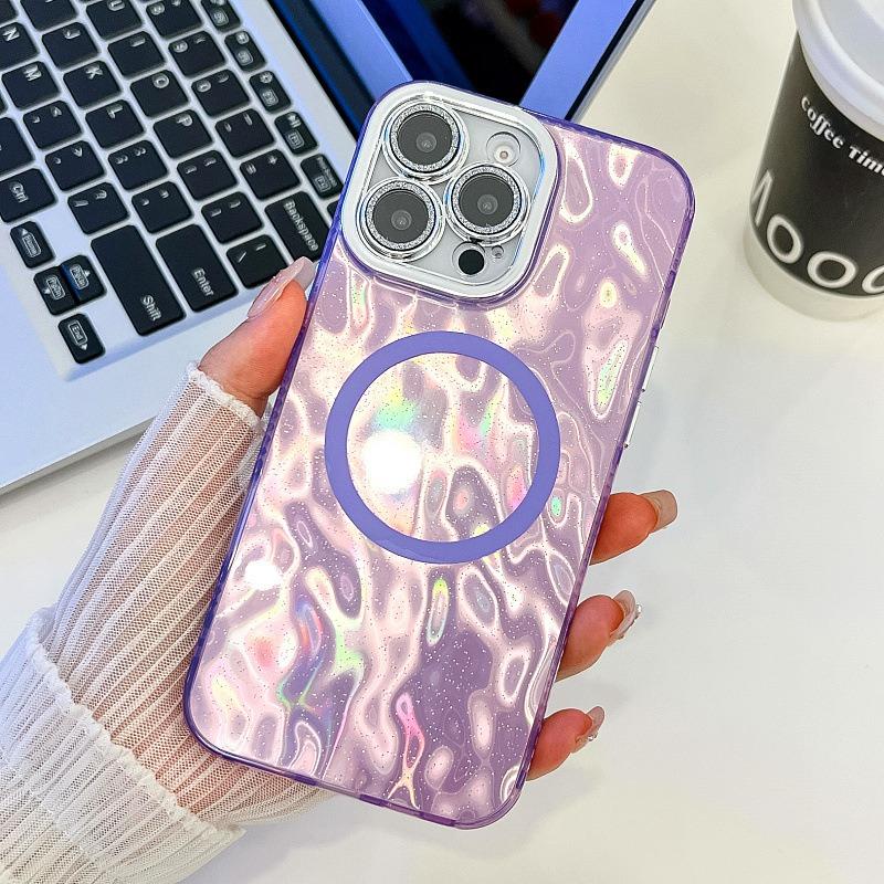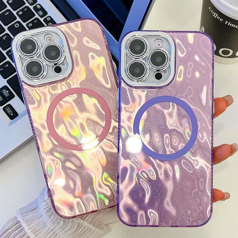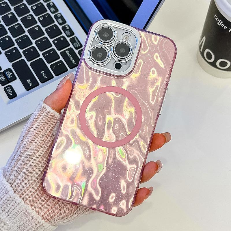 For iPhone 16ProMax 16 15 14 13 Phone Case, Electroplating Magnetic Laser Flow Silk Pattern Acrylic Slim With Glitter Len Protector, Protection Non-Yellowing Hard Cover
