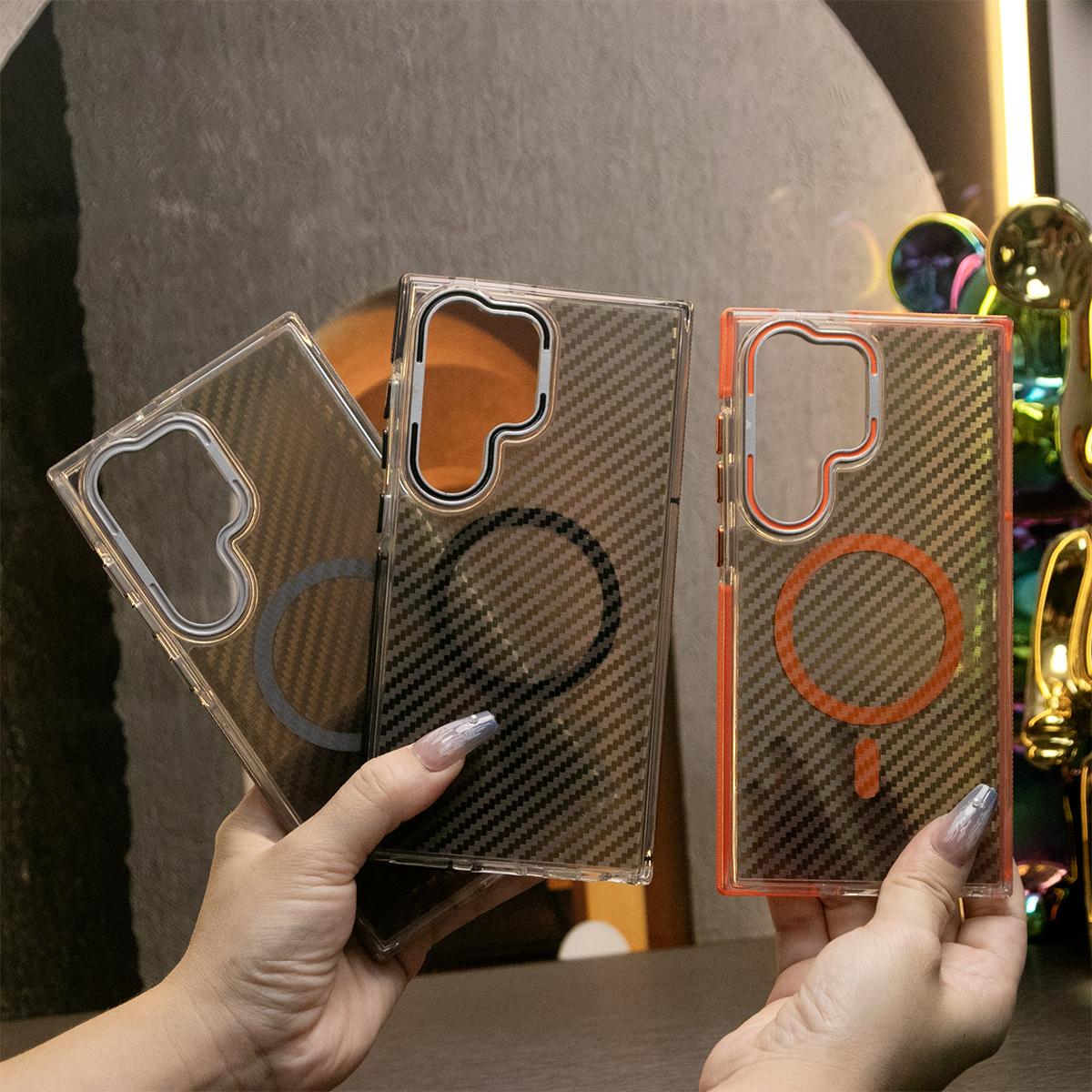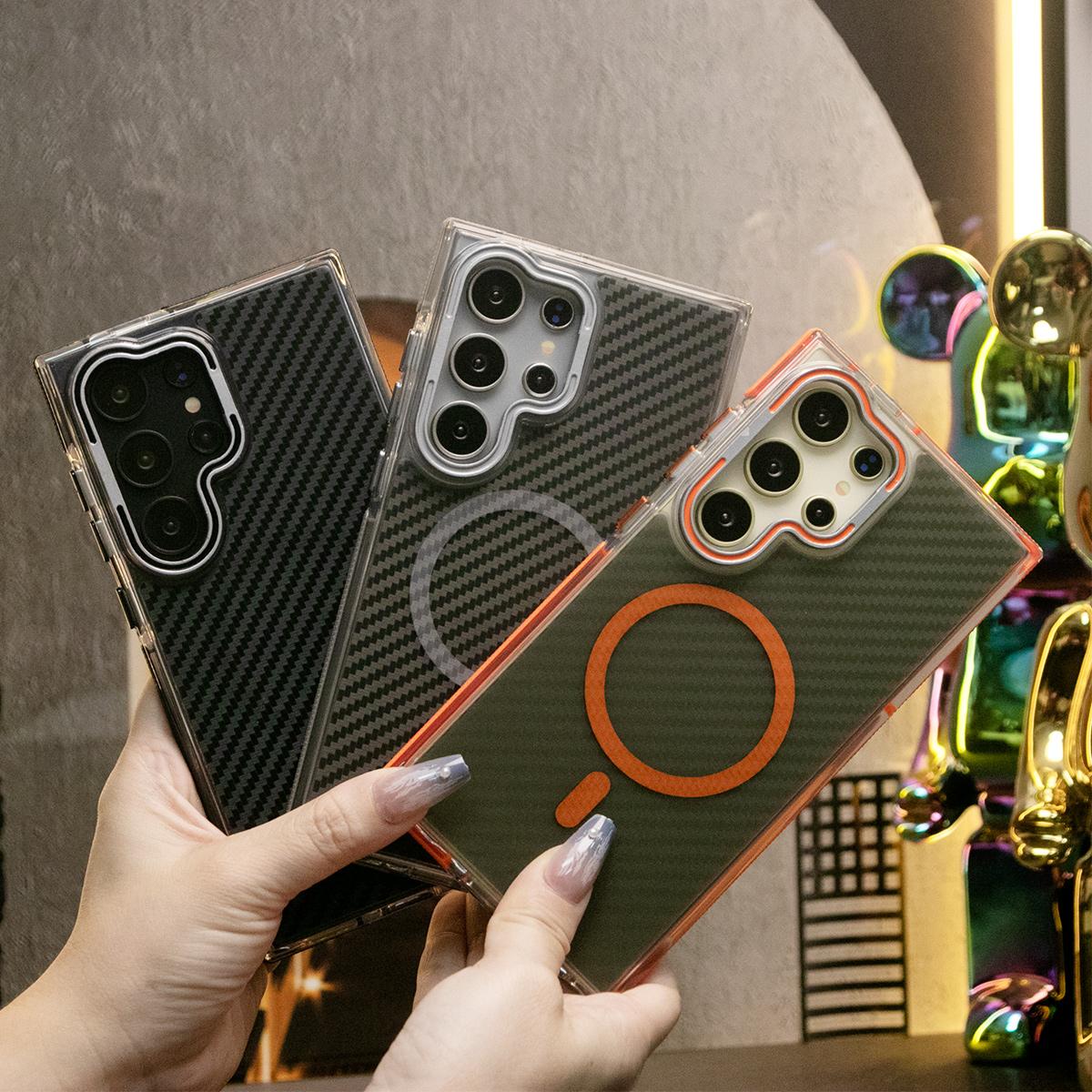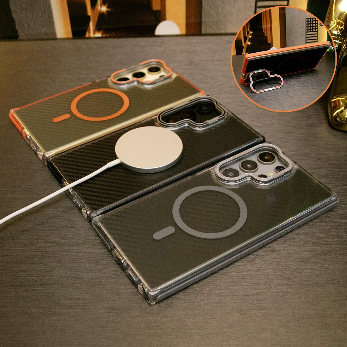 Magnetic Carbon Fiber Pattern Phone Case, Metal Hardware Camera Lens Stand Acrylic Cover, With Shockproof  Anti-Fall Bumper For Samsung S24 S23 S21FE A14 A15 A24 A25 A35 A54 A55 A05