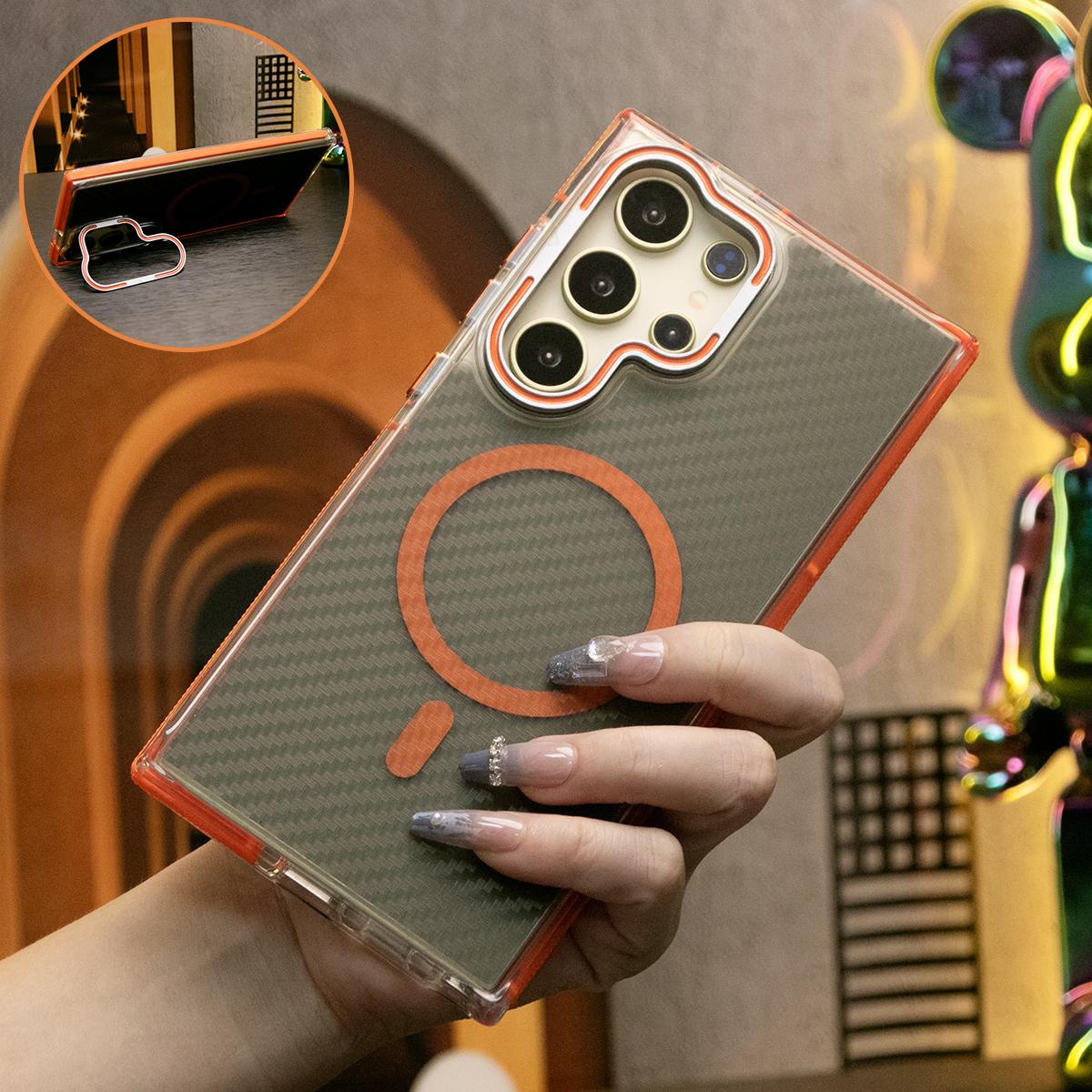 Magnetic Carbon Fiber Pattern Phone Case, Metal Hardware Camera Lens Stand Acrylic Cover, With Shockproof Anti-Fall Bumper For Samsung S24 S23 S21FE A14 A15 A24 A25 A35 A54 A55 A05