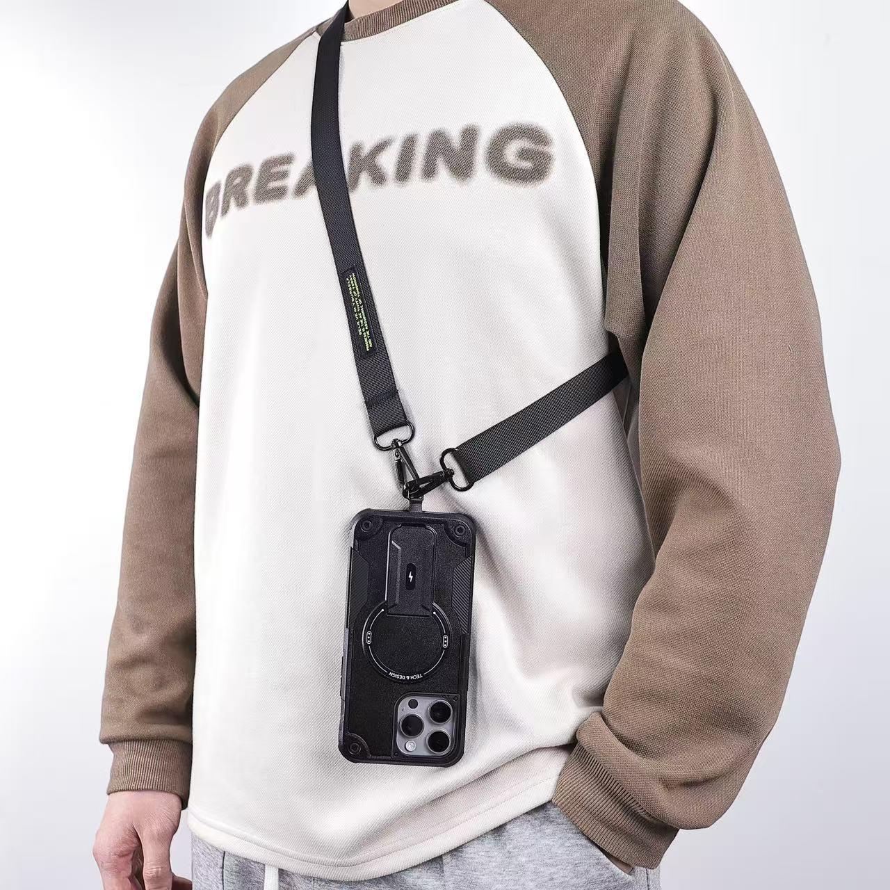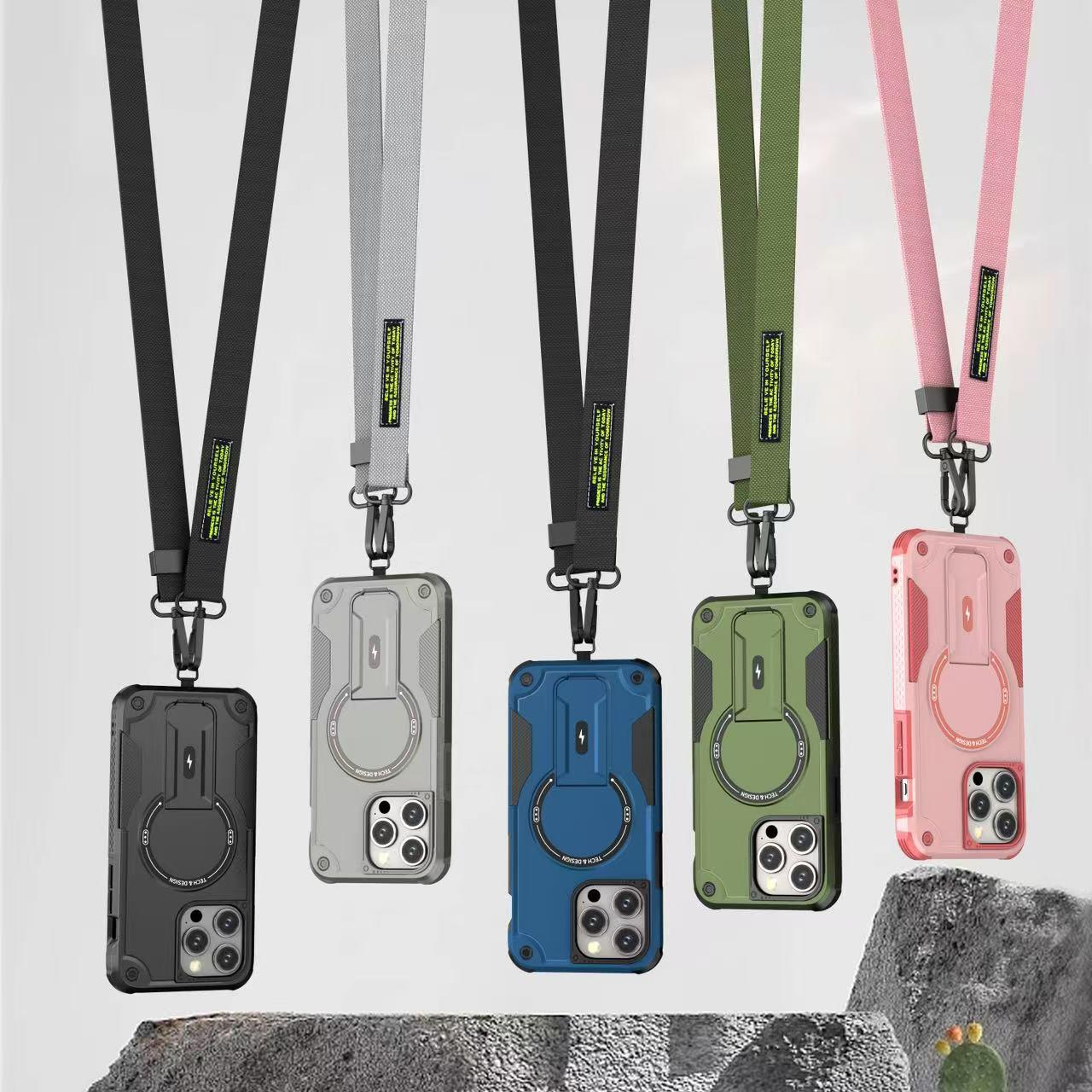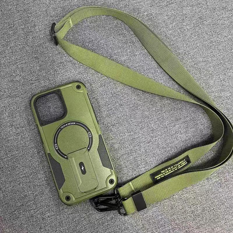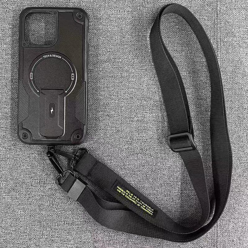 Mecha Style Drop Resistant Magnetic Stand With slingfor Phone Case iPhone 16 15 14 13 12 Pro Max, Slant The Straps Portable Kickstand PC Cover
