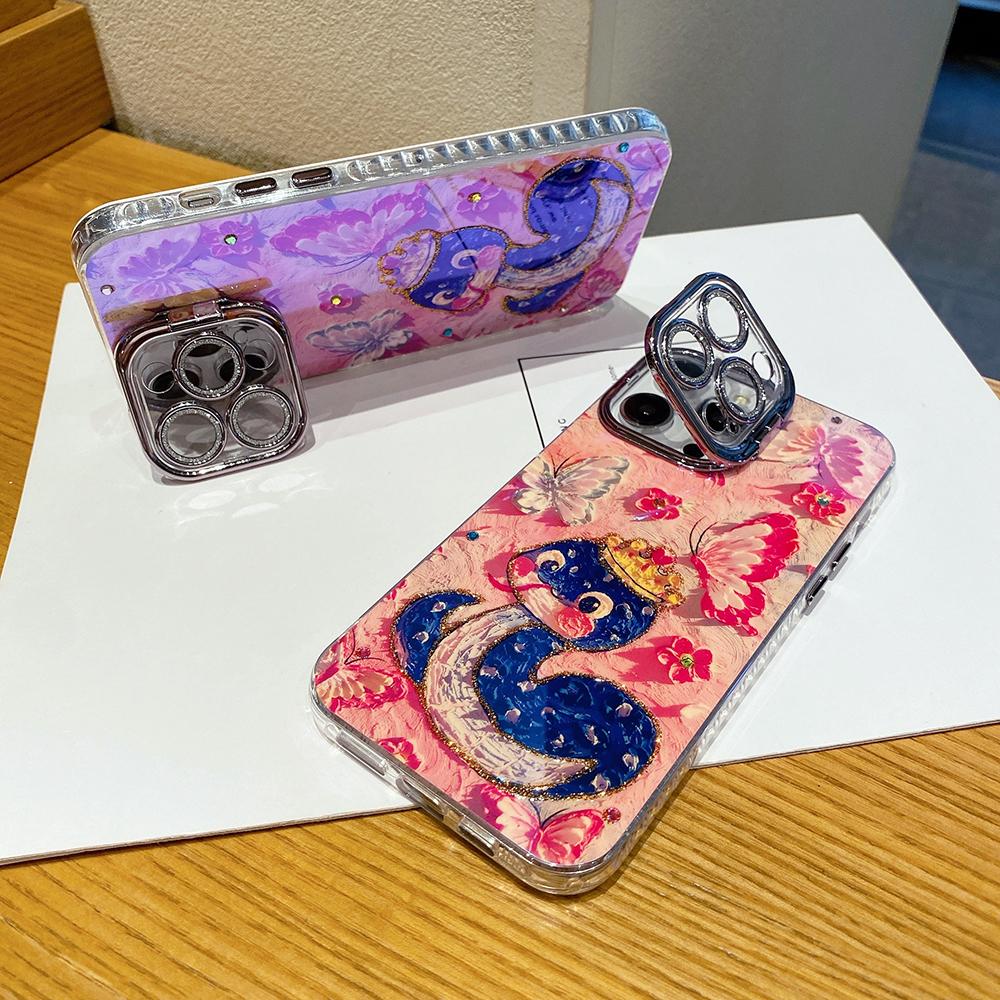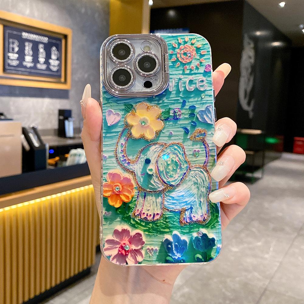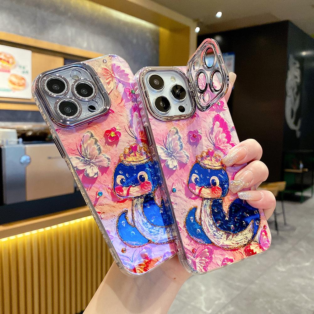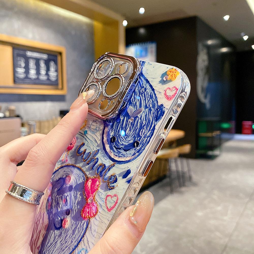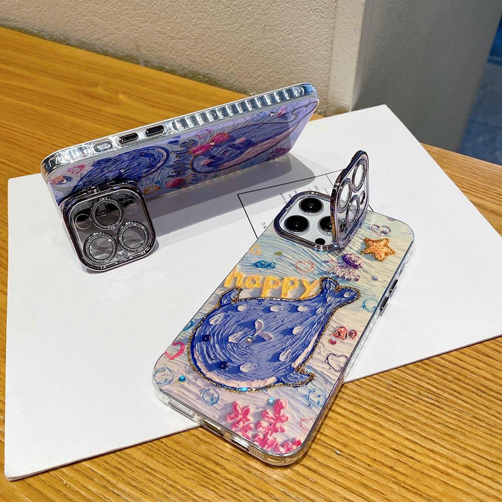 For iPhone 16ProMax 16 15 14 13 12 11 Phone Case with Diamond Camera Kickstand, Dolphin Whale Panda Elephant Snake Animal, Oil Painting Camera Frame Anti-drop Hard Shockproof Full Cover