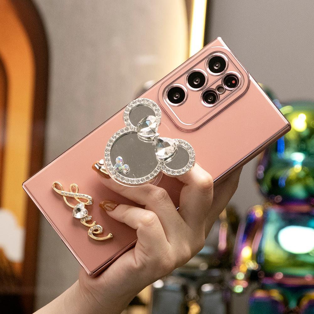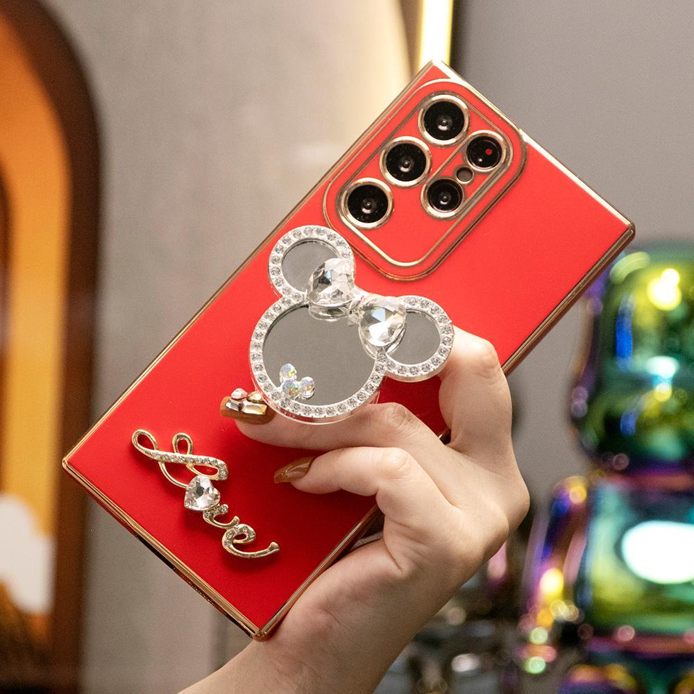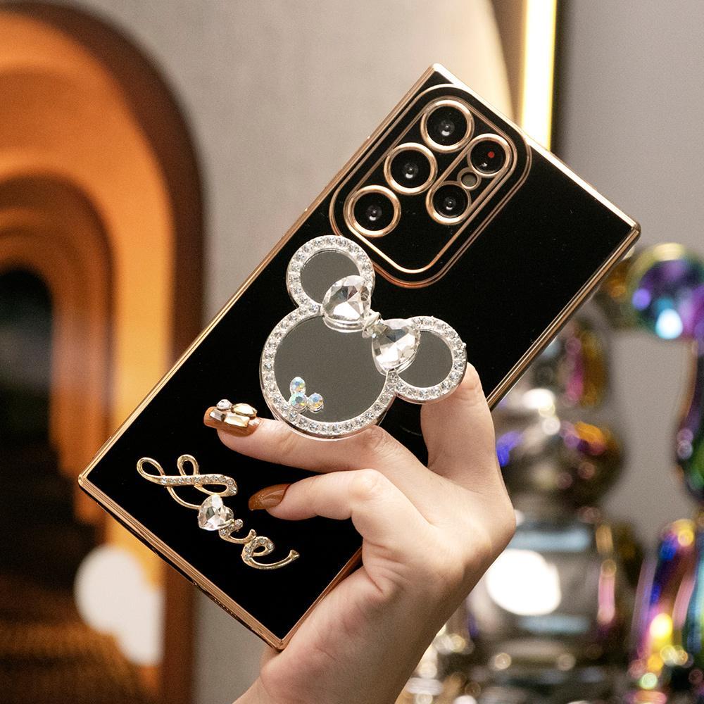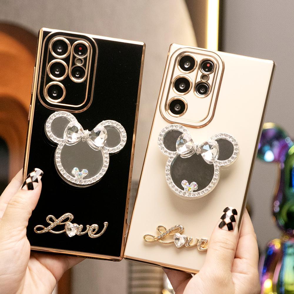 Für Samsung S23 S22 S21 A13 A14 A23 A24 A34 A52 A53 A54 Hülle, Mauskopf-Spiegel-Ständer, Liebesherz-Beschichtung, luxuriöse, elegante Hülle, Kameraschutz, stoßfeste PopStand-Softcover