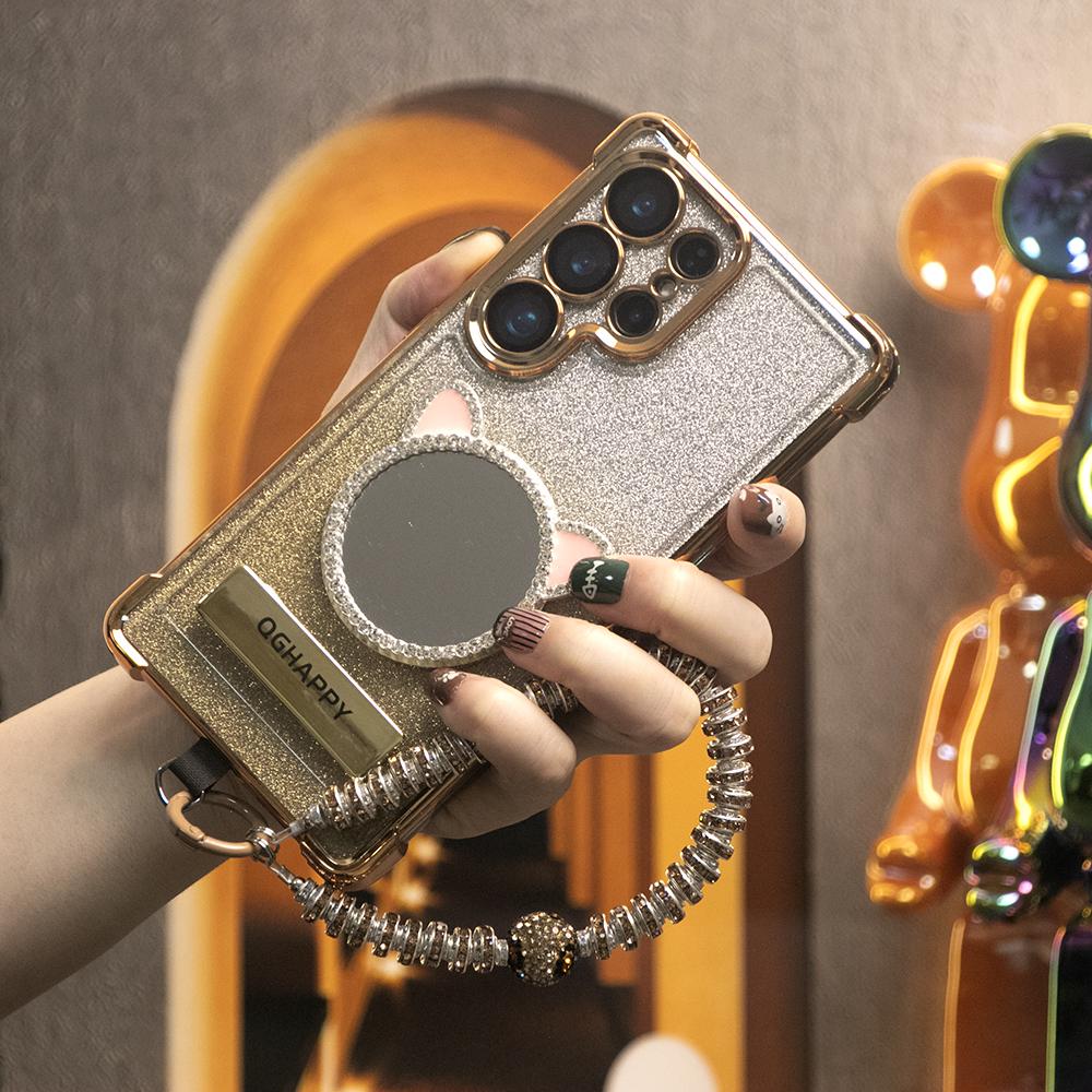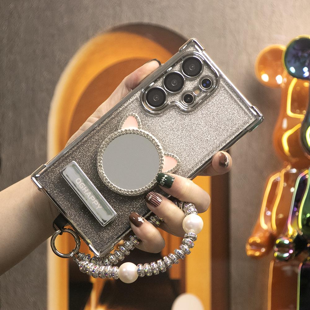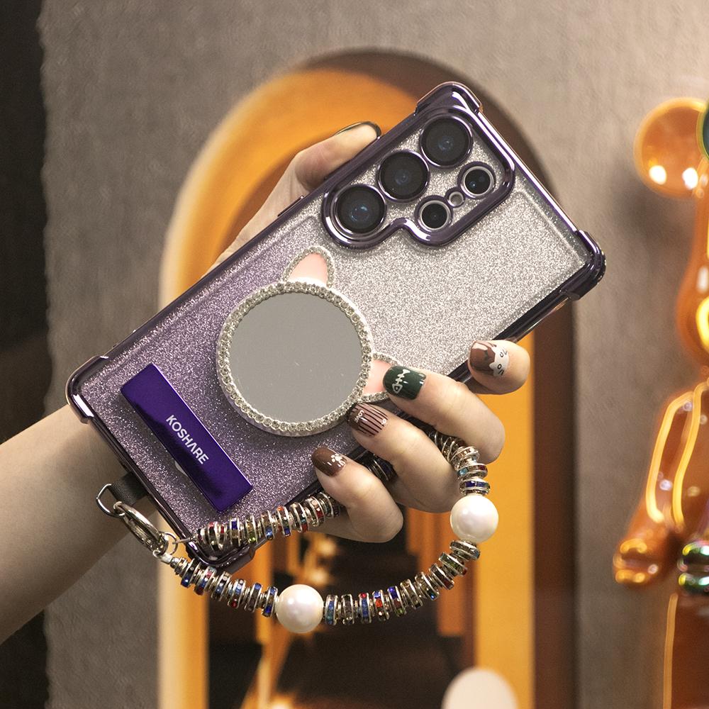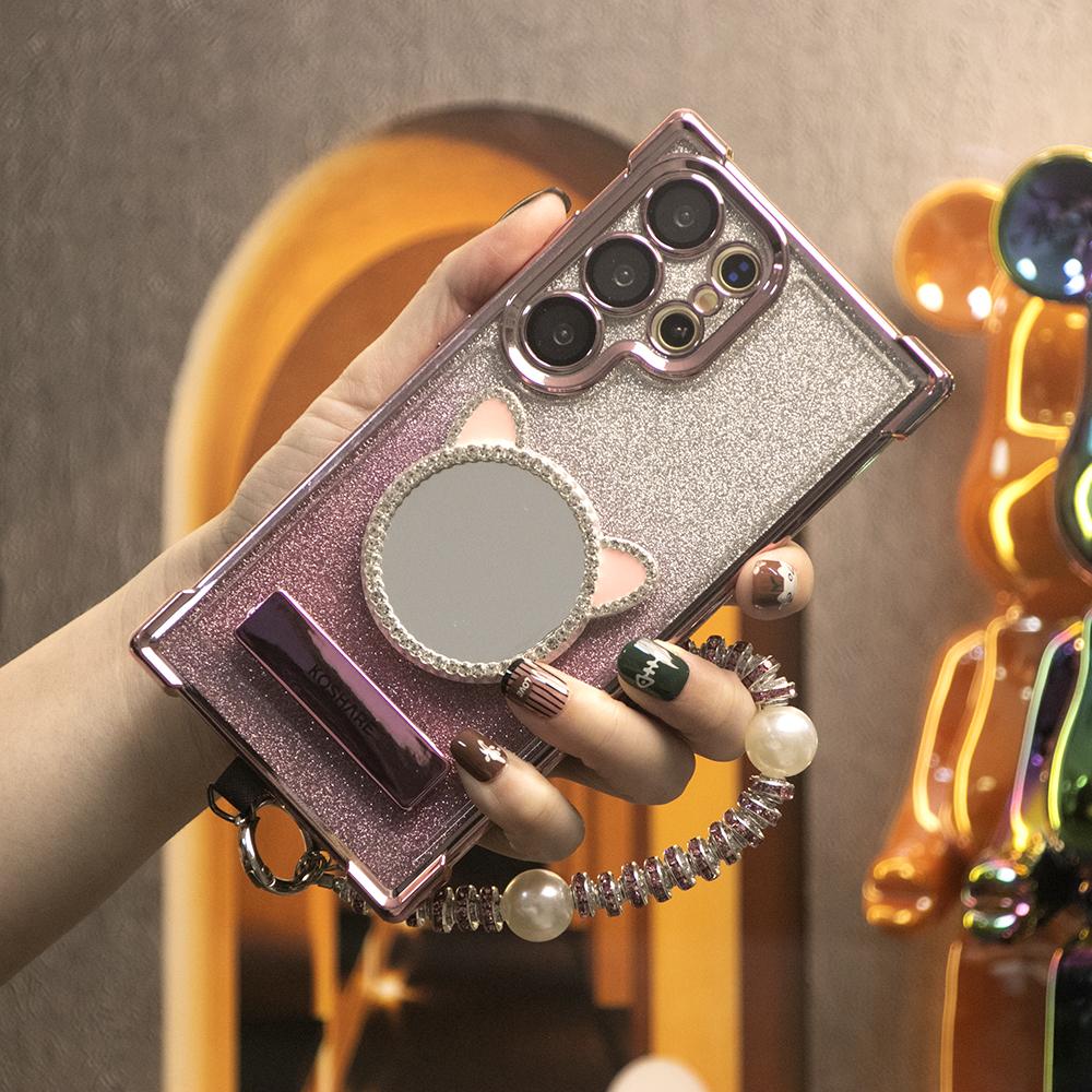 Gradient Plating Four Corners Cat Mirror Thin Kickstand Case with Pearl Diamond Wristband for Samsung S25Ultra S25 S24 S23 S22 S21 Note20 A53 A54 A55 Hard Acrylic Bumper Full Cover