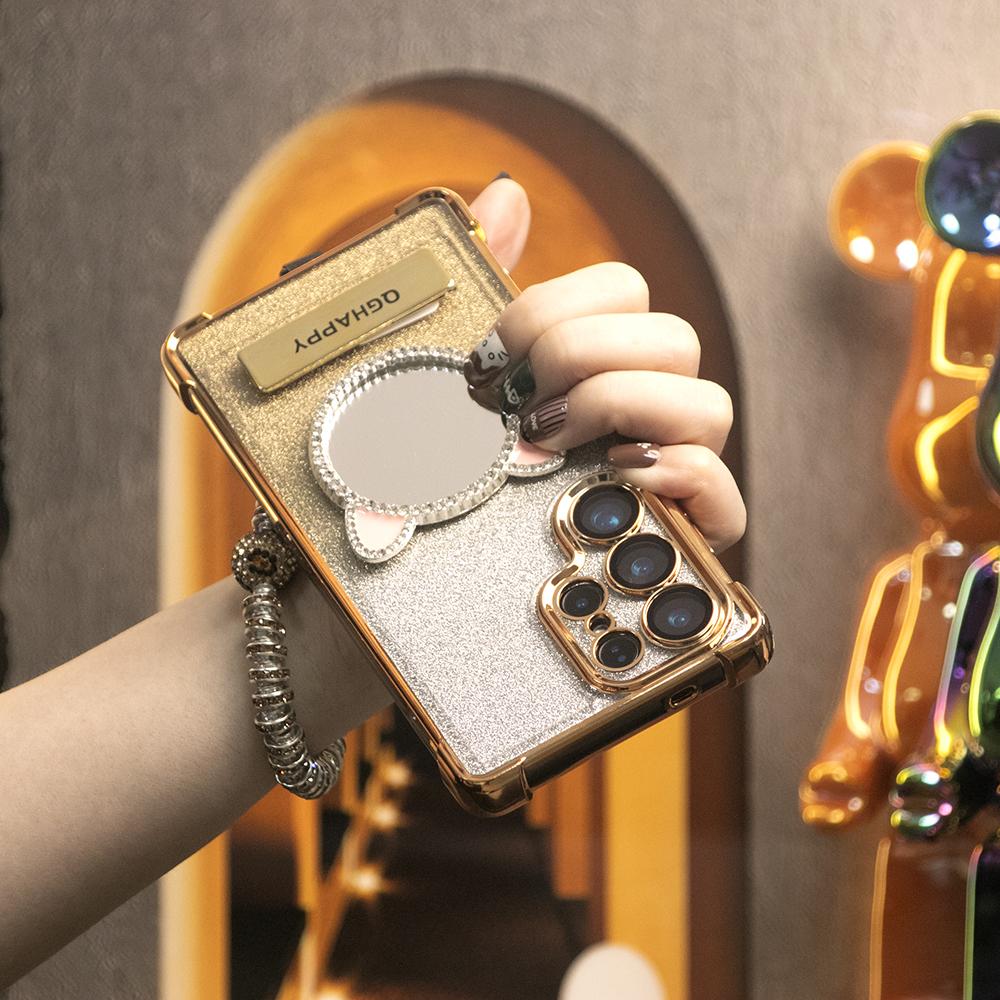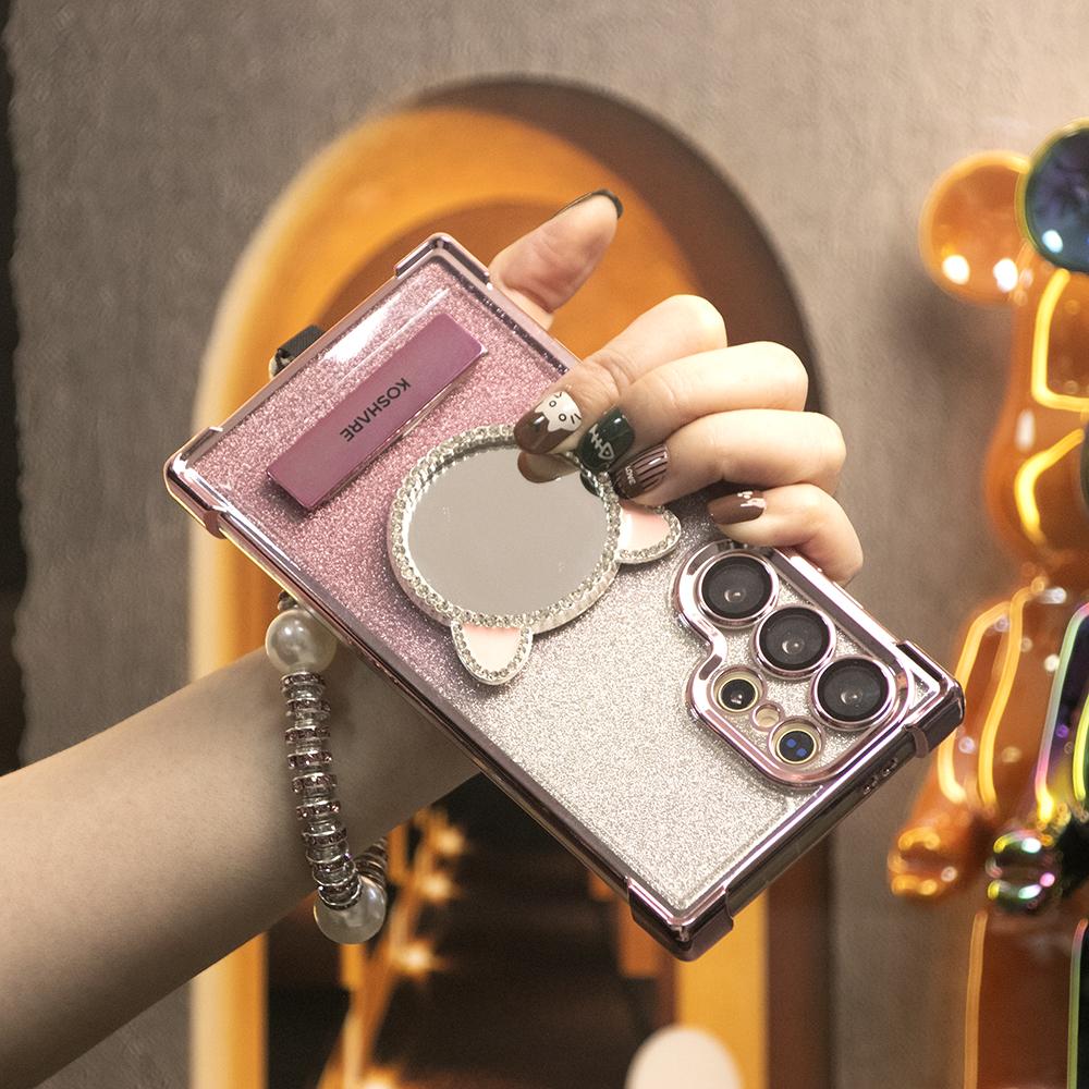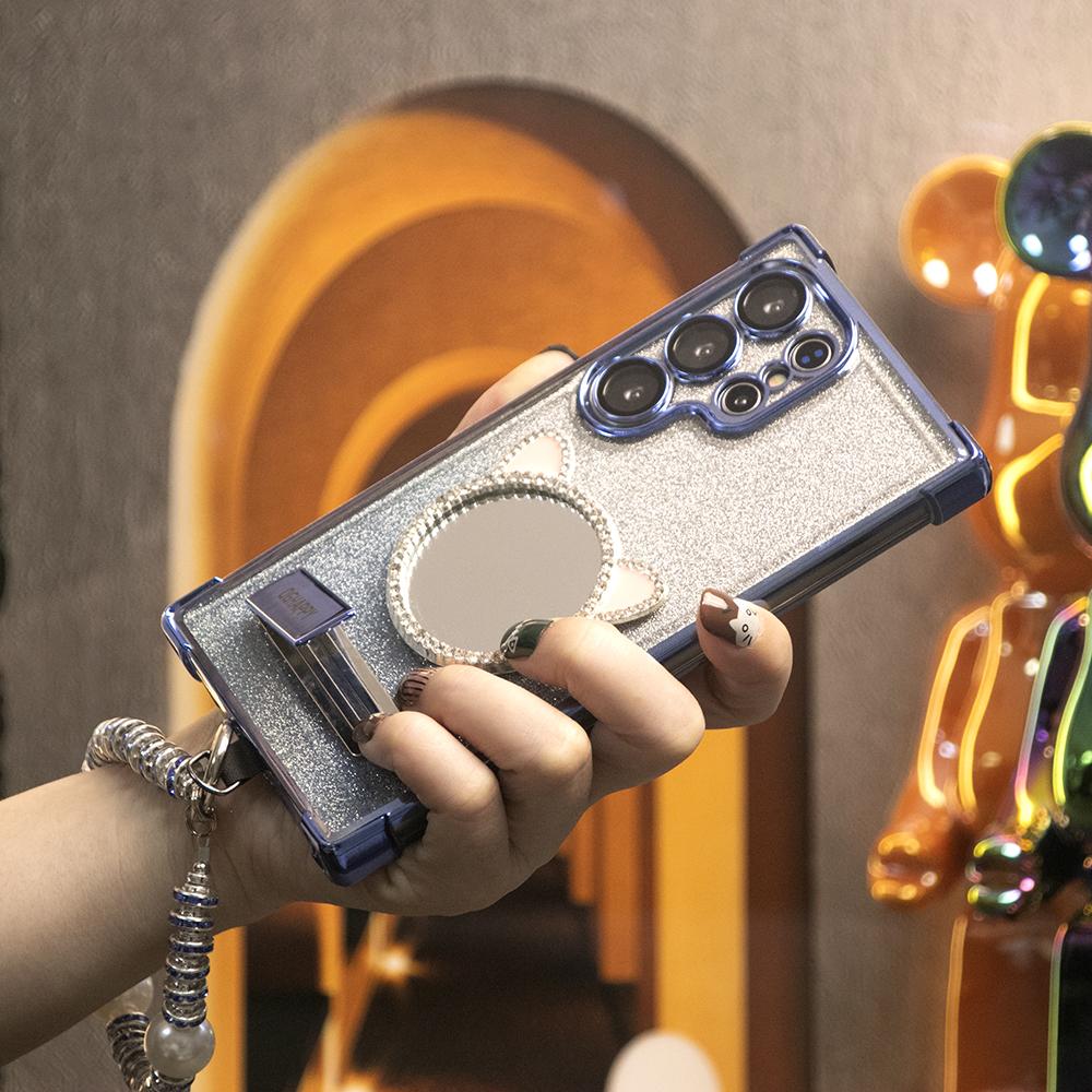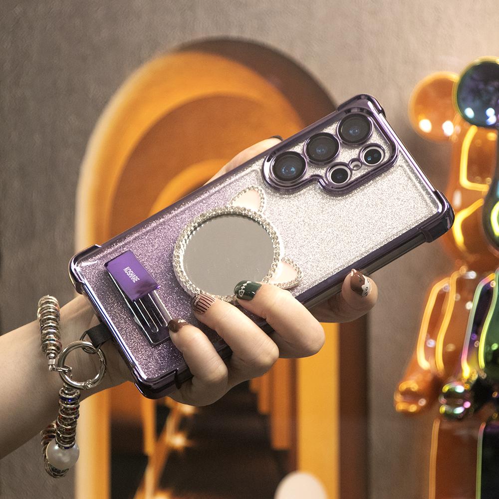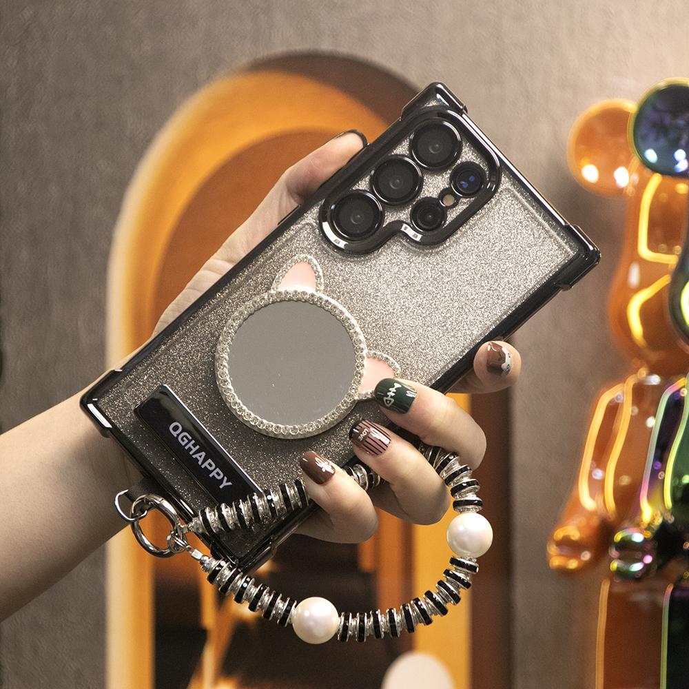 Gradient Plating Four Corners Cat Mirror Thin Kickstand Case with Pearl Diamond Wristband for Samsung S25Ultra S25 S24 S23 S22 S21 Note20 A53 A54 A55 Hard Acrylic Bumper Full Cover