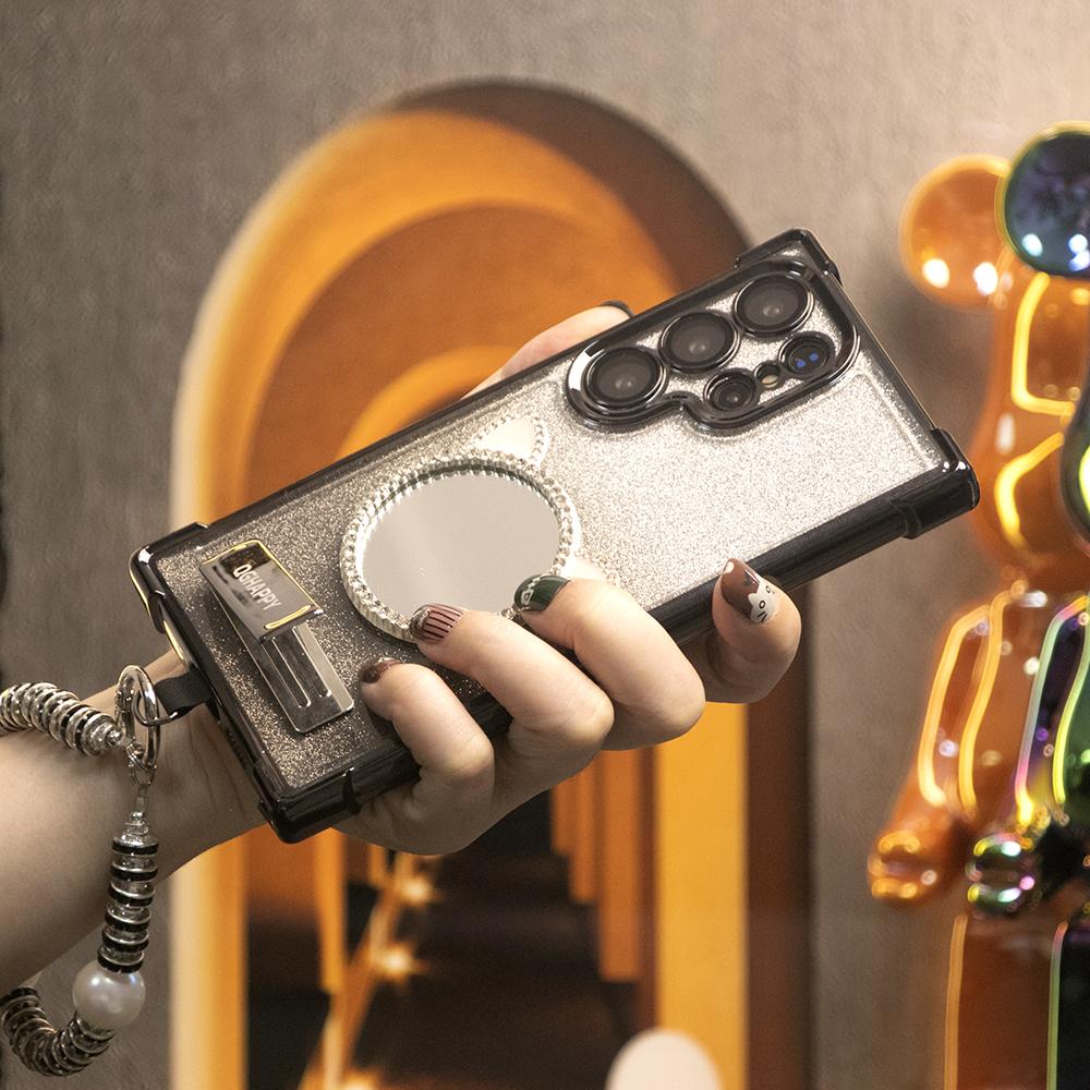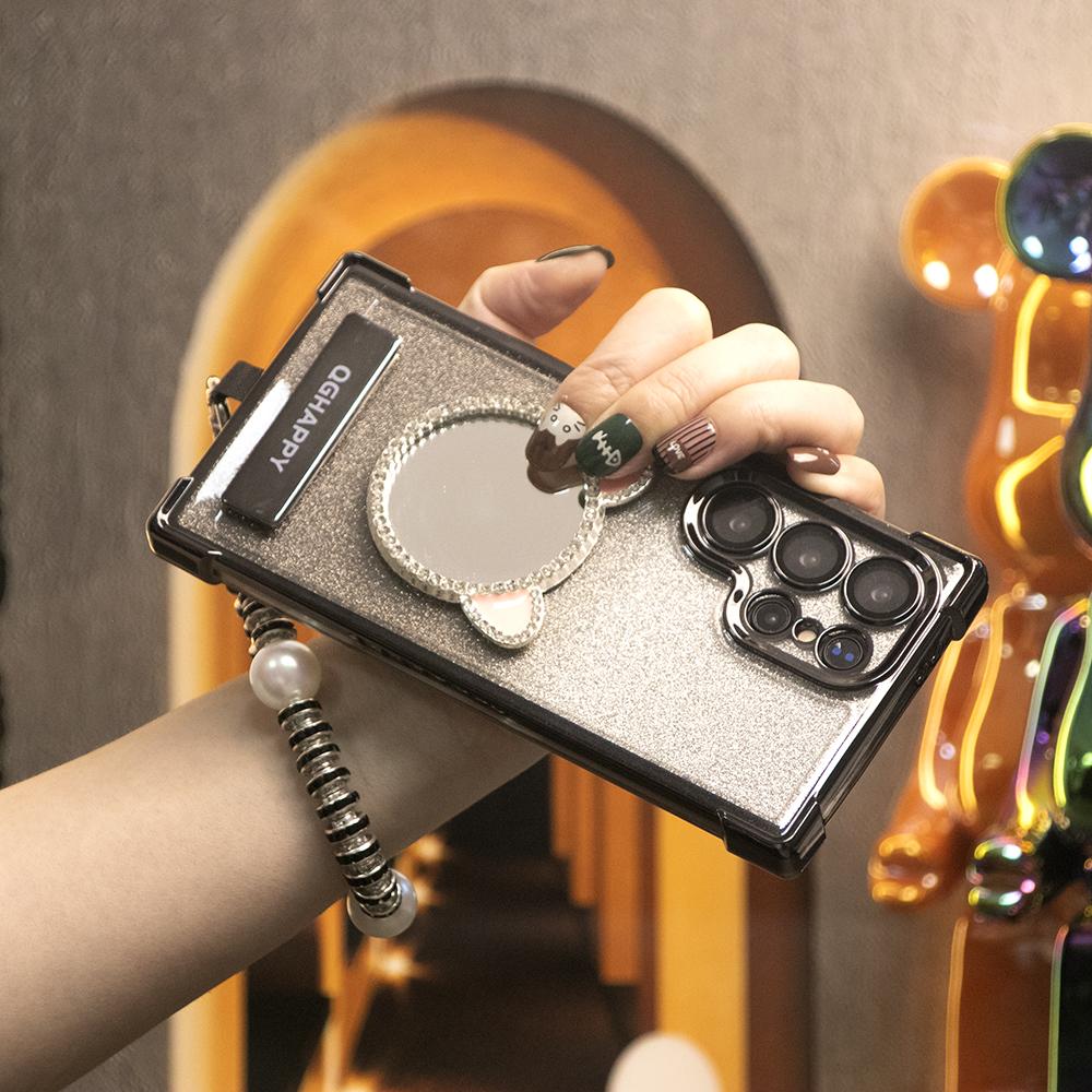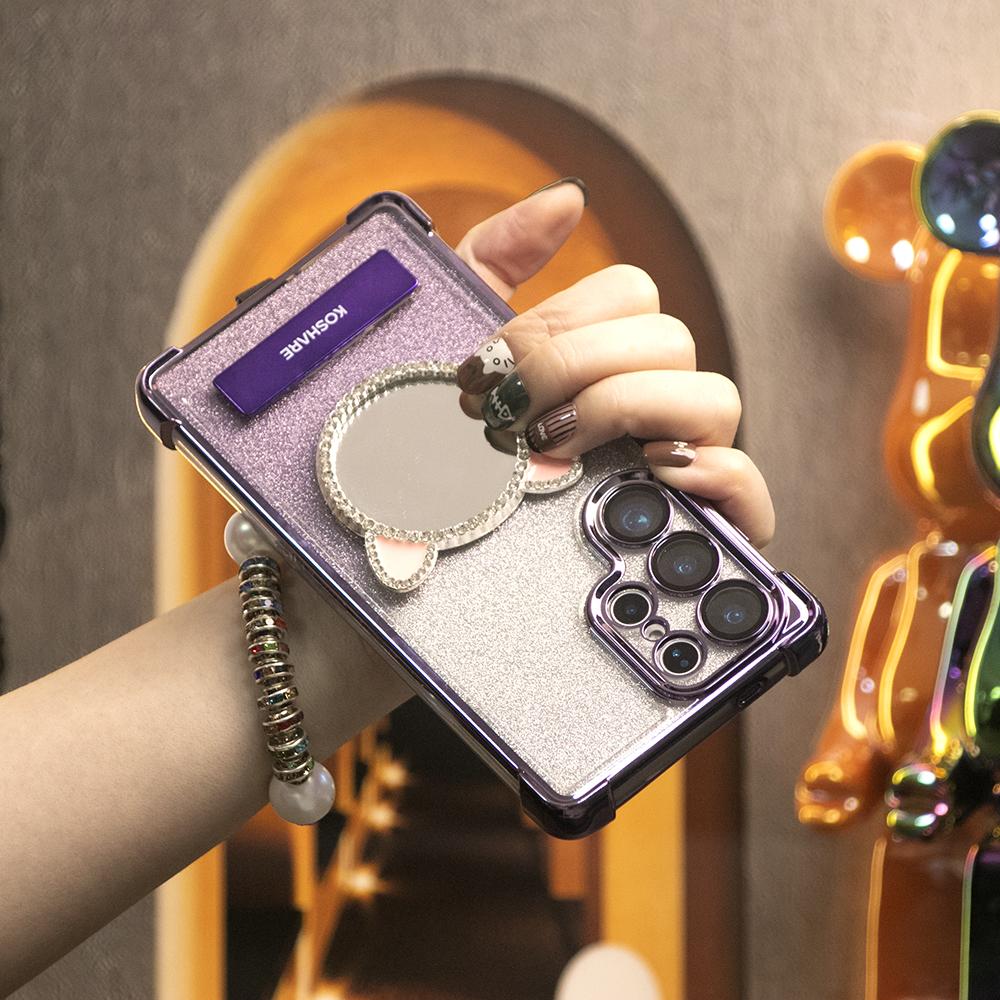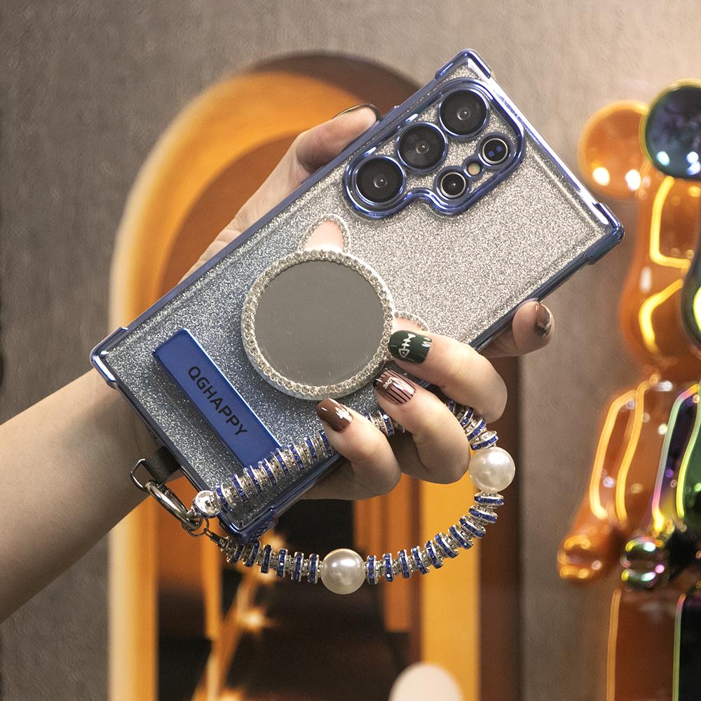 Gradient Plating Four Corners Cat Mirror Thin Kickstand Case with Pearl Diamond Wristband for Samsung S25Ultra S25 S24 S23 S22 S21 Note20 A53 A54 A55 Hard Acrylic Bumper Full Cover