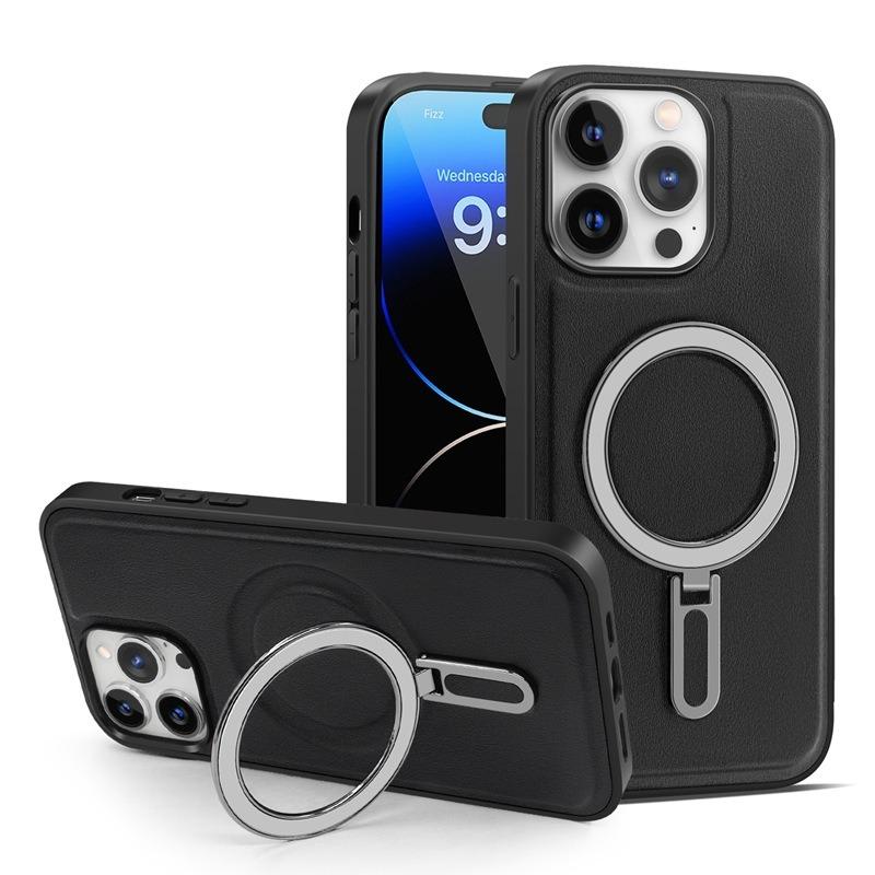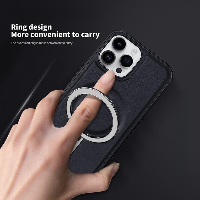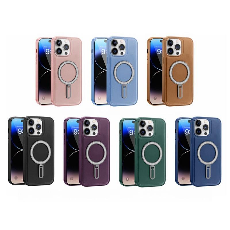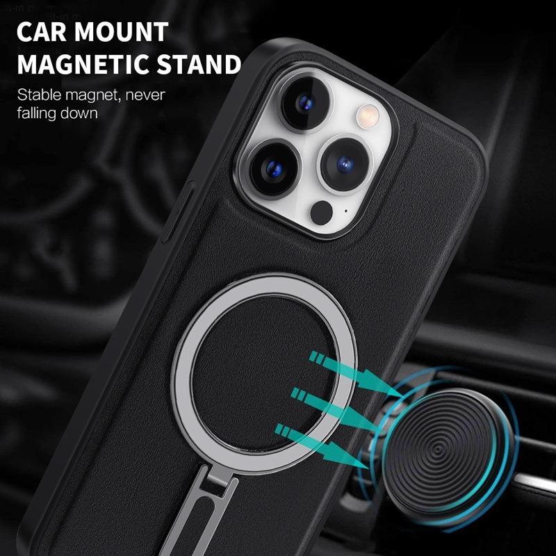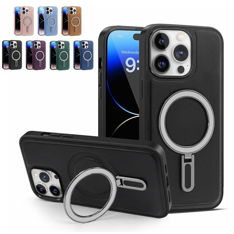 Luxury Full Leather Glossy Kickstand Phone Case For Magsafe For iPhone 16ProMax 16 15 14 13 12 11 Metal Ring Magnetic Metal Holder Shockproof Stand Back Cover