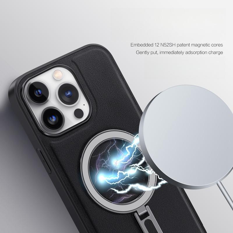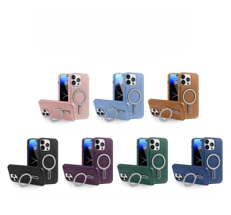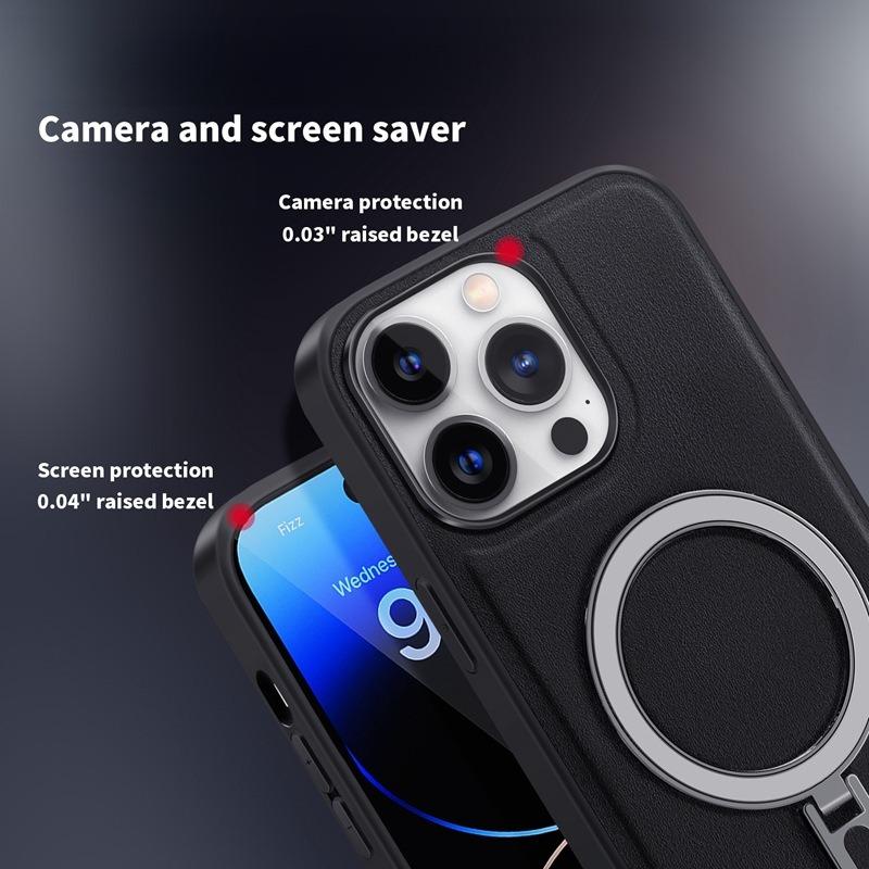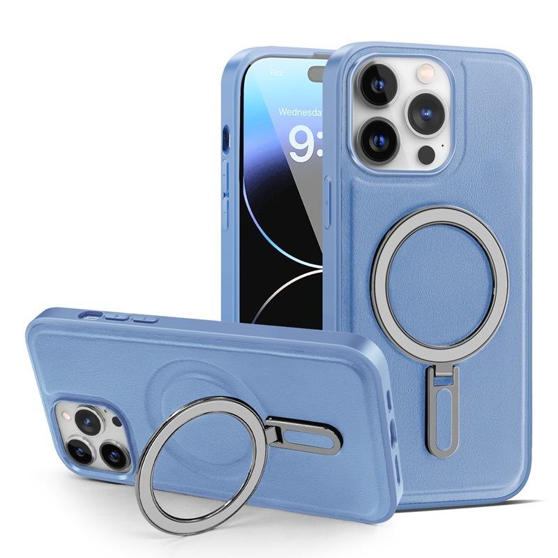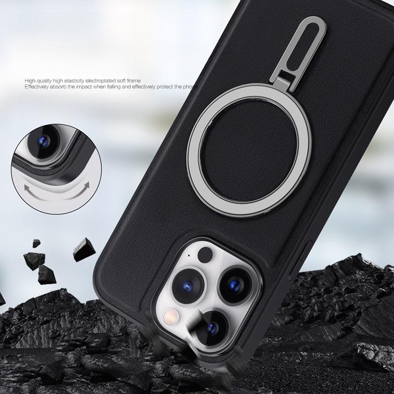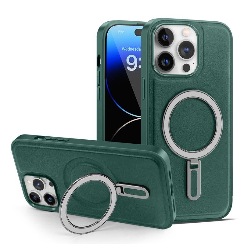 Luxury Full Leather Glossy Kickstand Phone Case For Magsafe For iPhone 16ProMax 16 15 14 13 12 11 Metal Ring Magnetic Metal Holder Shockproof Stand Back Cover