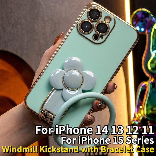 For iPhone 16 15 14 13 12 Pro Max Phone Case, Windmill Kickstand with Bracelet, Plating Electroplate Luxury Elegant Case Camera Protector Pop Stand Shockproof Soft Cover