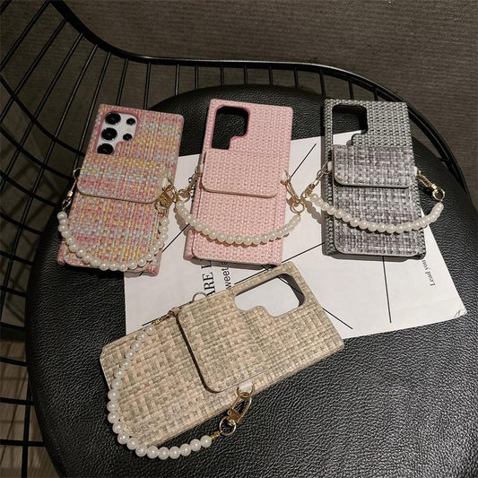 For Samsung S25Ultra S24 S23 S22 Case With Pearl Wristband, Gradient Woven Pattern Fabrics Wallet Shockproof Card Slot Hard Full Cover