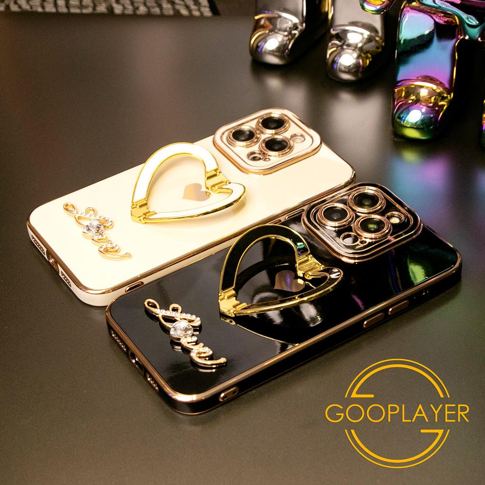 For iPhone 16 15 14 13 12 11 Pro Max, Luxury Love Heart Kickstand Holder Plating Soft Camera Protector Phone Case