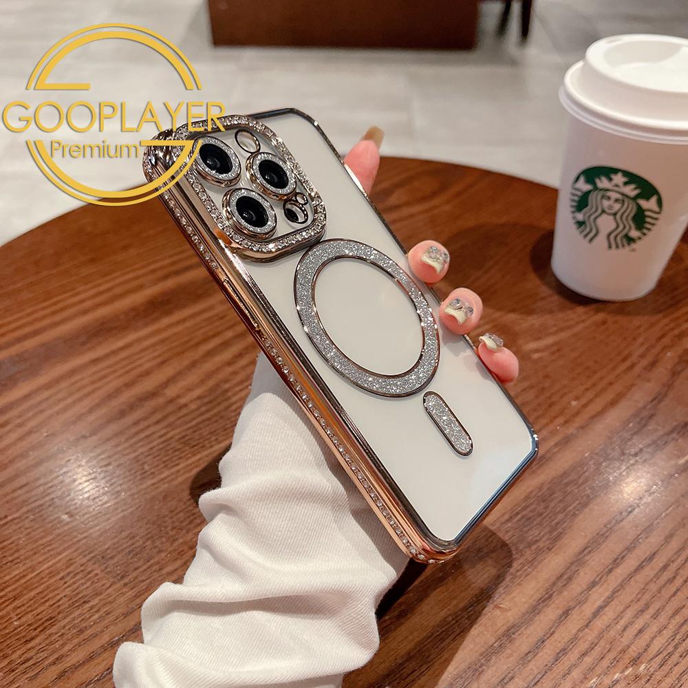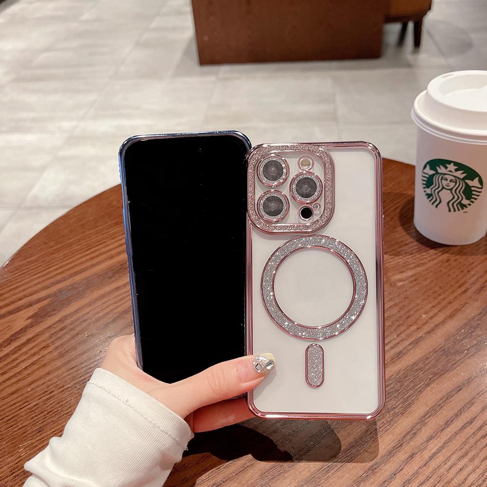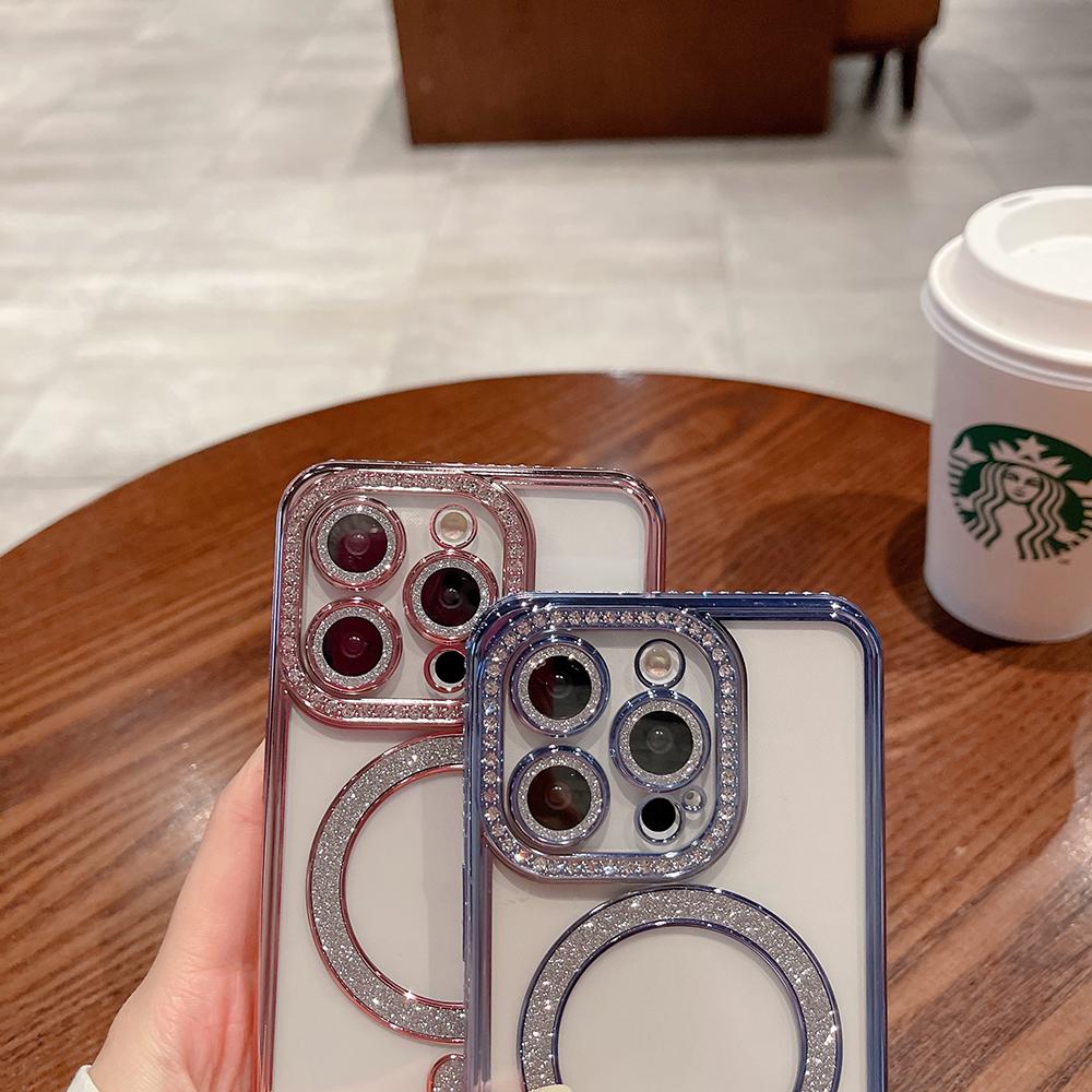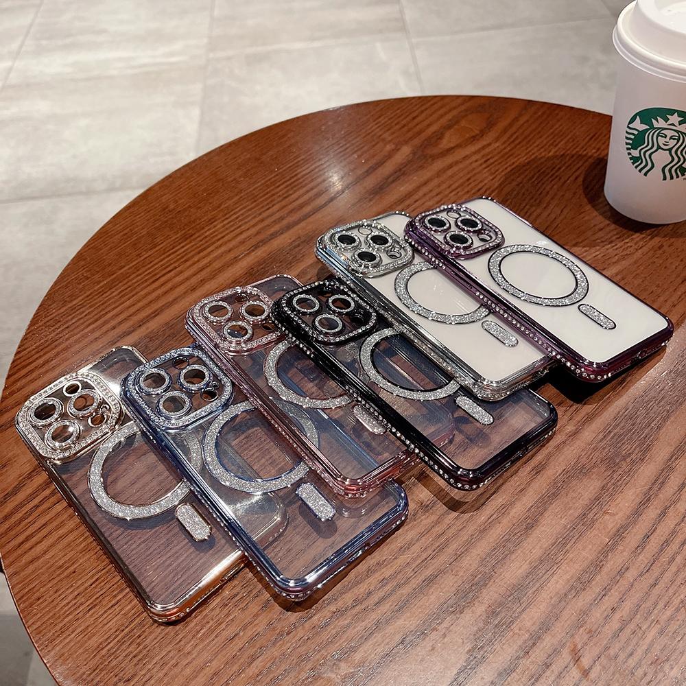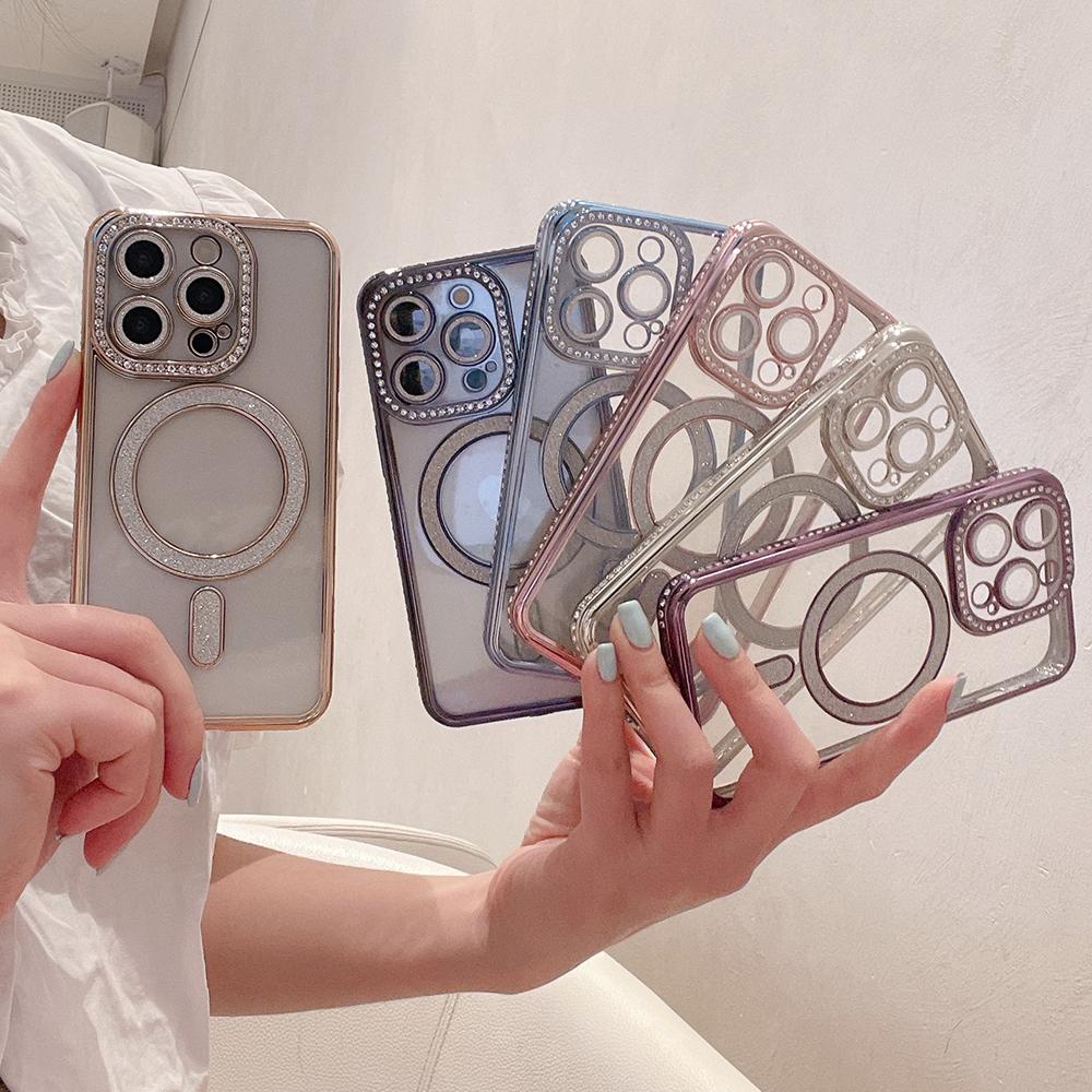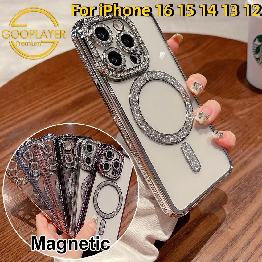 For iPhone 16 15 14 13 12 Pro Max Phone Case, Glitter Luxury Rhinestone Clear Magnetic Support Wireless Charging TPU Built-in Camera Protector for Magsafe Hard Full Cover