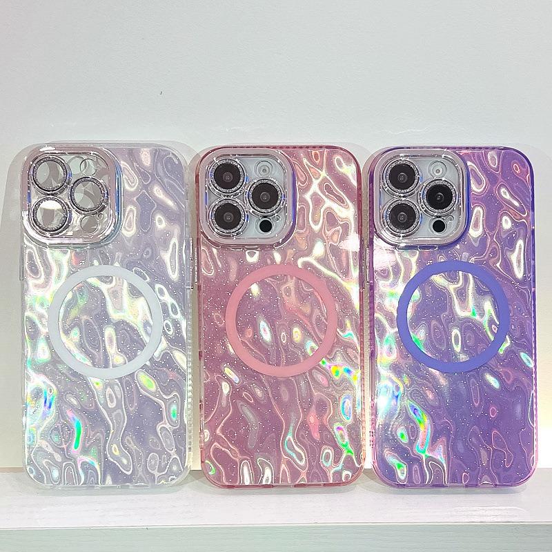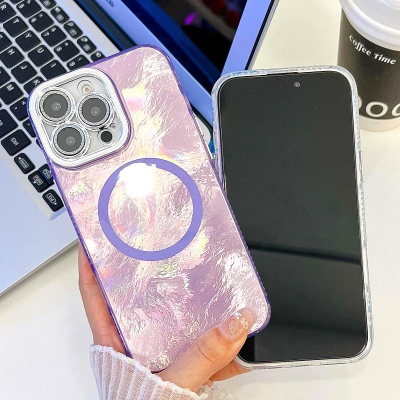 For iPhone 16ProMax 16 15 14 13 Phone Case, Electroplating Magnetic Laser Flow Silk Pattern Acrylic Slim With Glitter Len Protector, Protection Non-Yellowing Hard Cover
