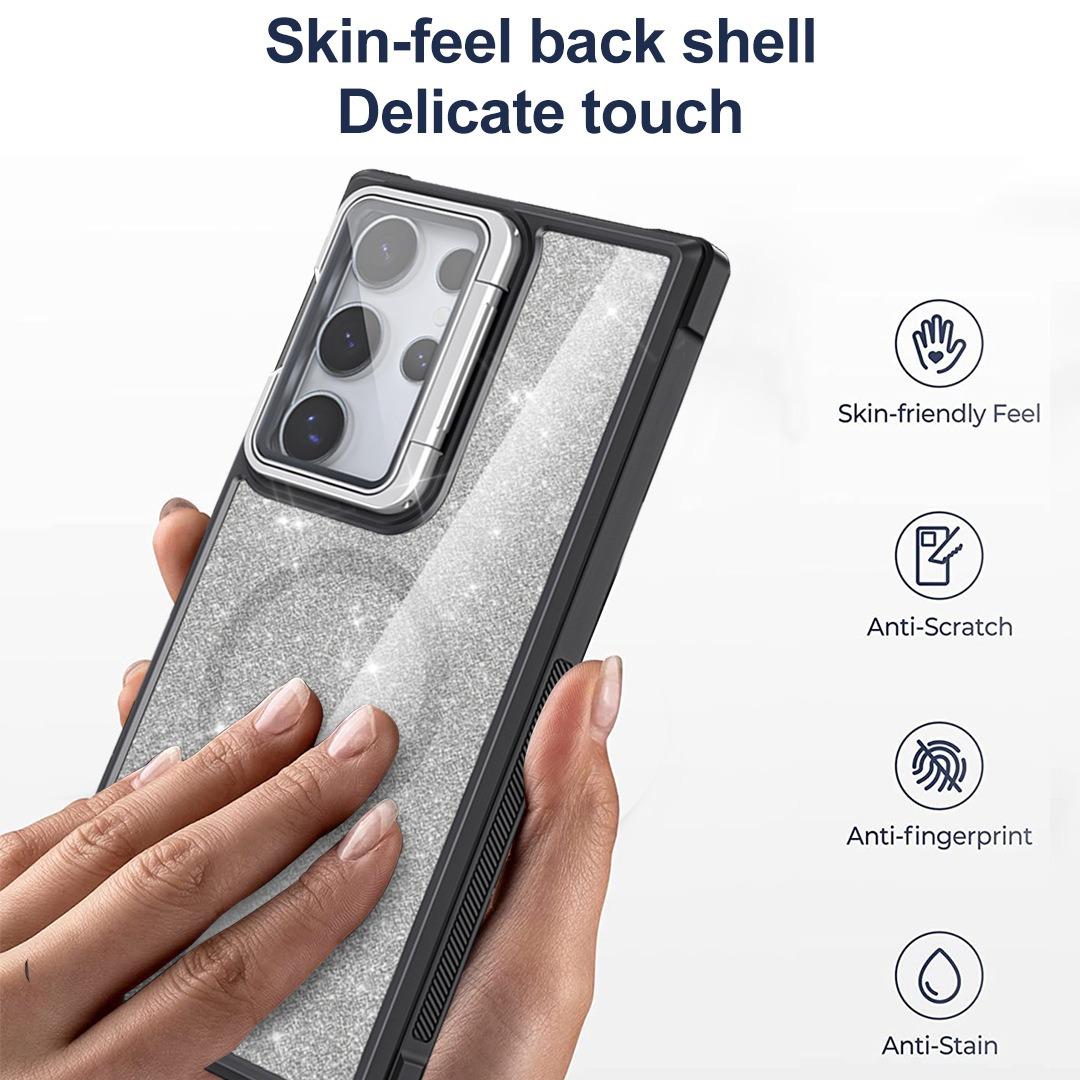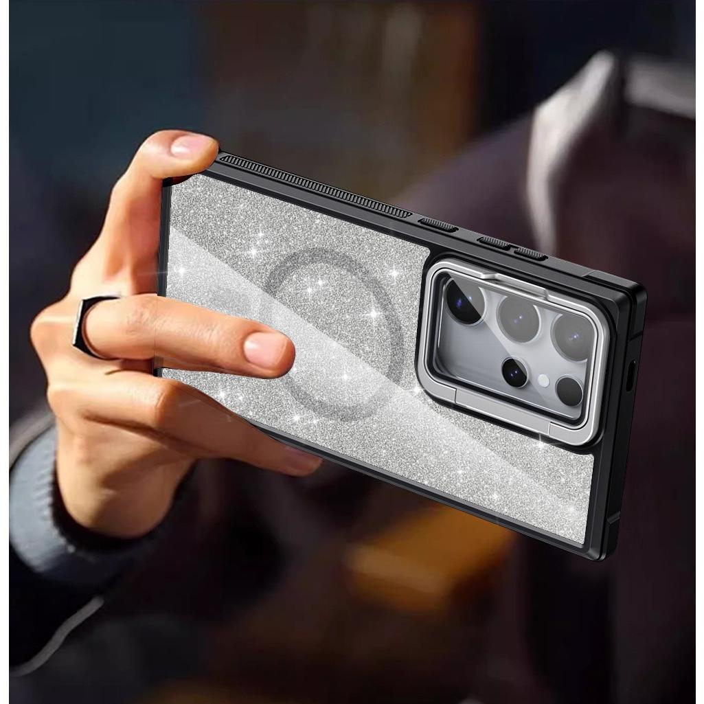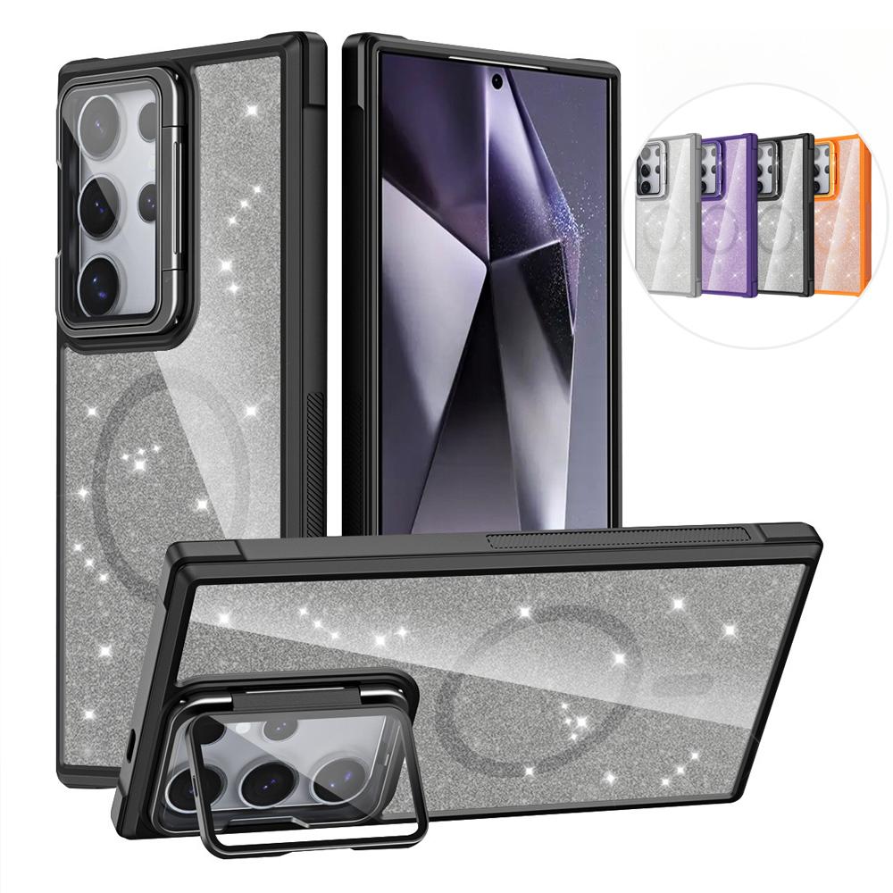 For Samsung S25Ultra S25 S24 S23 S21FE S20FE Strong Magnetic Phone Case, Glass Camera Kickstand Protection, Glitter Clear Acrylic Four Corner Shockproof Bumper Hand Feel Hard Full Cover