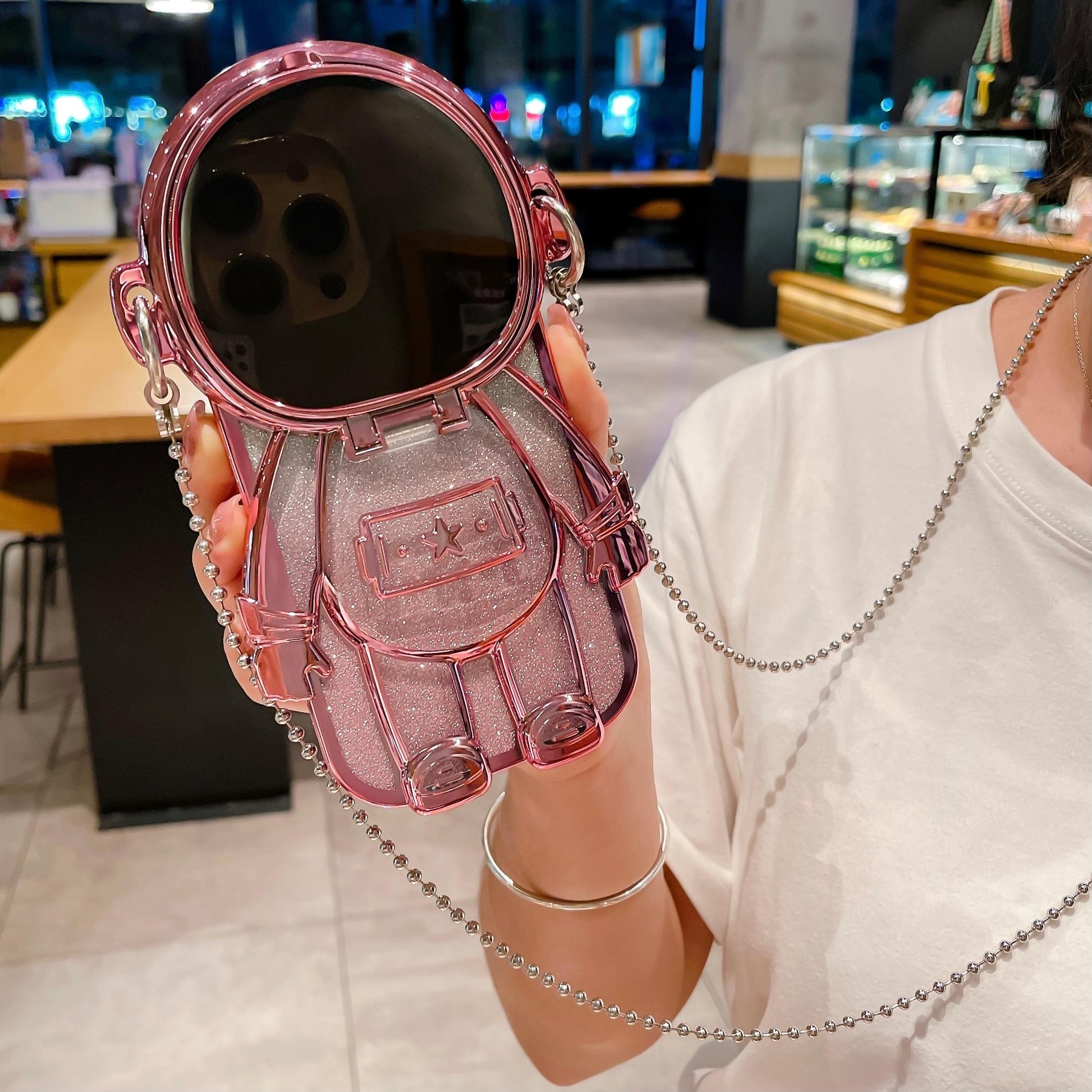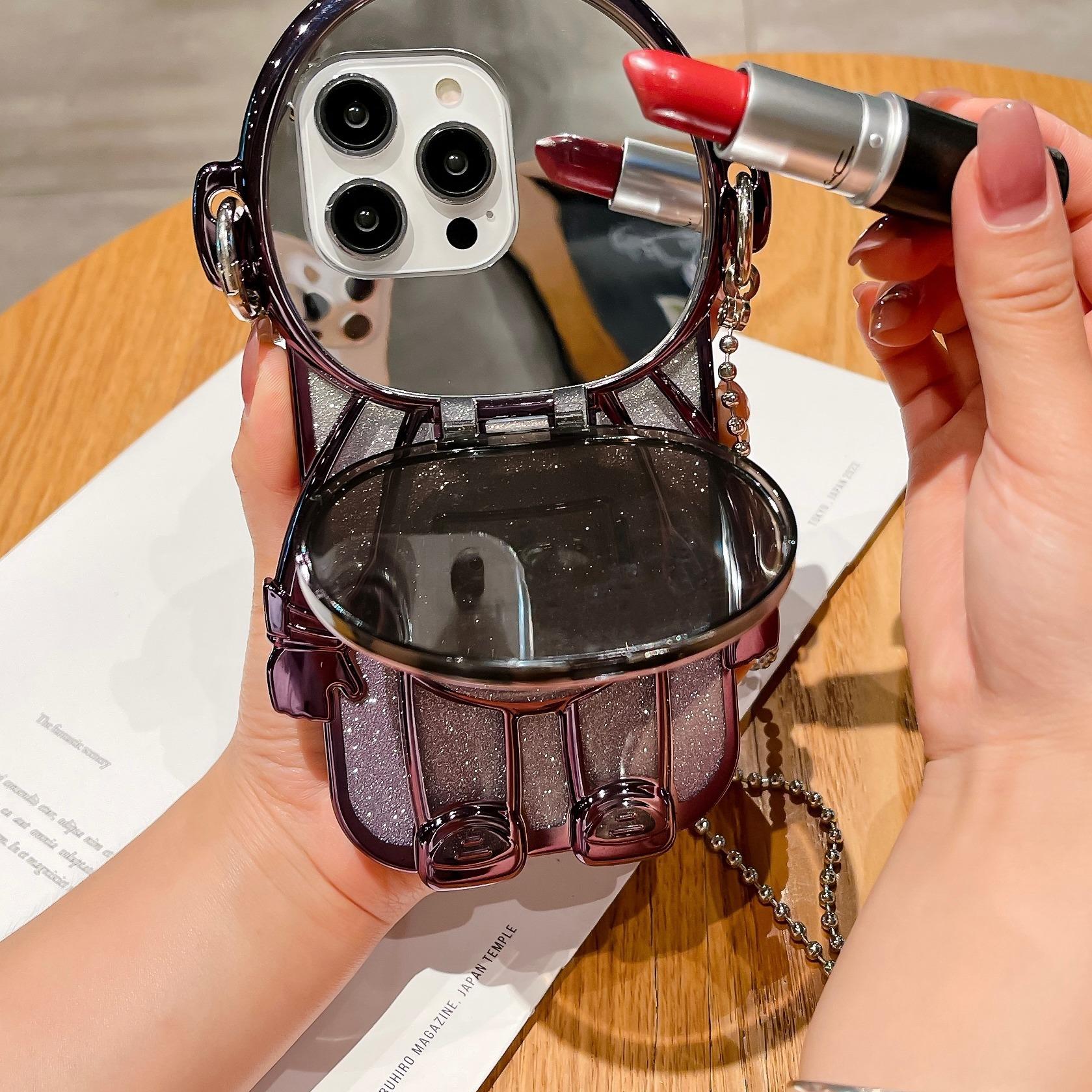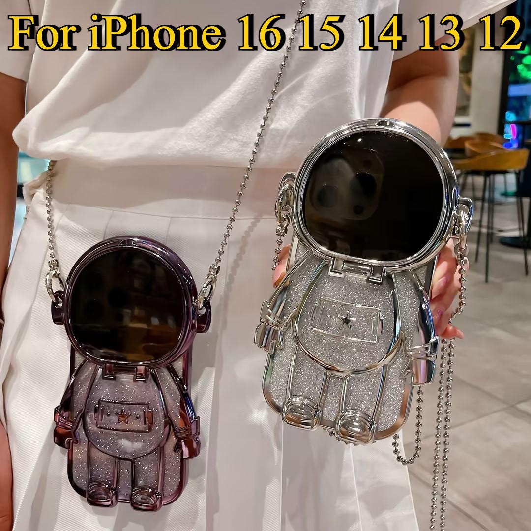Luxury Glitter Diagonal Hanging Chain Plating Mirror Astronaut Case For iPhone 16 15 14 13 12 Pro Max Fashion Bracket Square Case Back Cover
