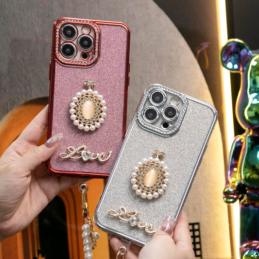 Coque de téléphone avec chaîne de bouteille de parfum en diamant pailleté pour iPhone 16 15 14 13 12 Pro Max