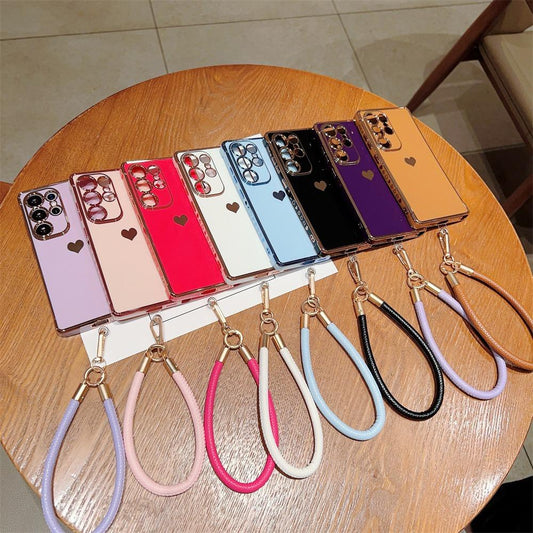 Plating Love Heart TPU Phone Case with Leather Wristband For Samsung S25Ultra S24 S23 S22 S21 Shockproof Soft Full Cover
