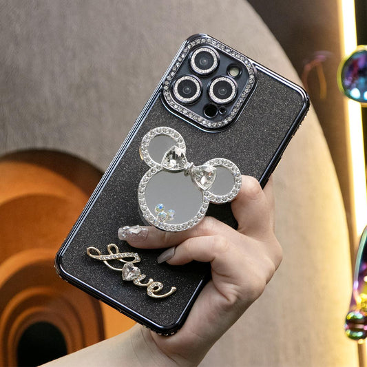 Coque de téléphone avec miroir et béquille pour iPhone 16 15 14 13 12 Pro Max avec tête de souris à paillettes et diamants