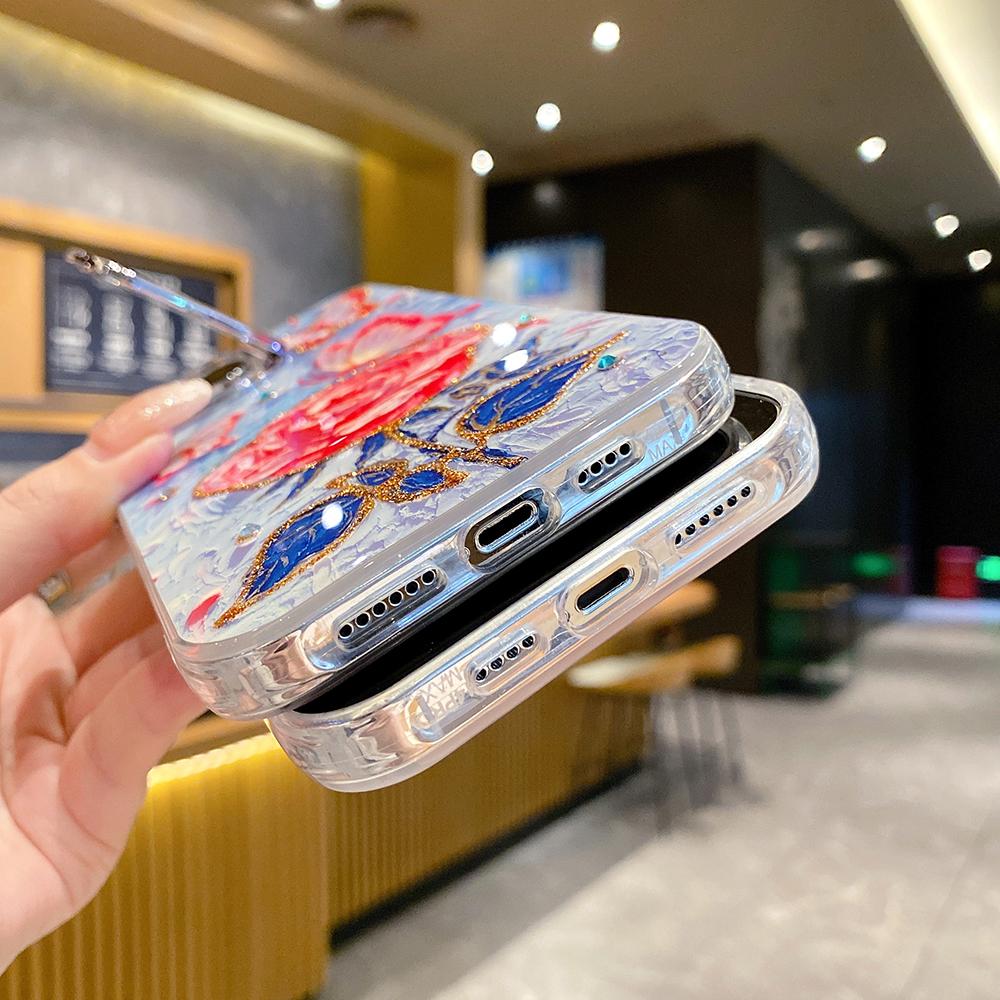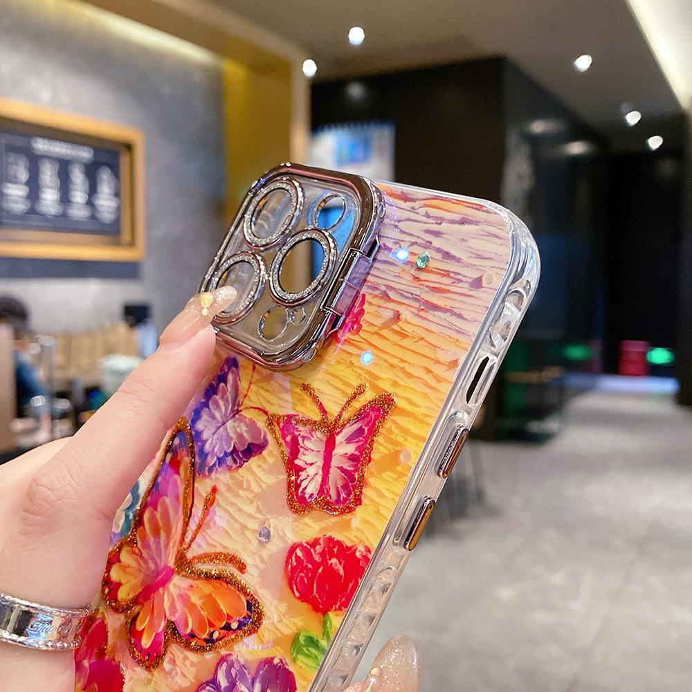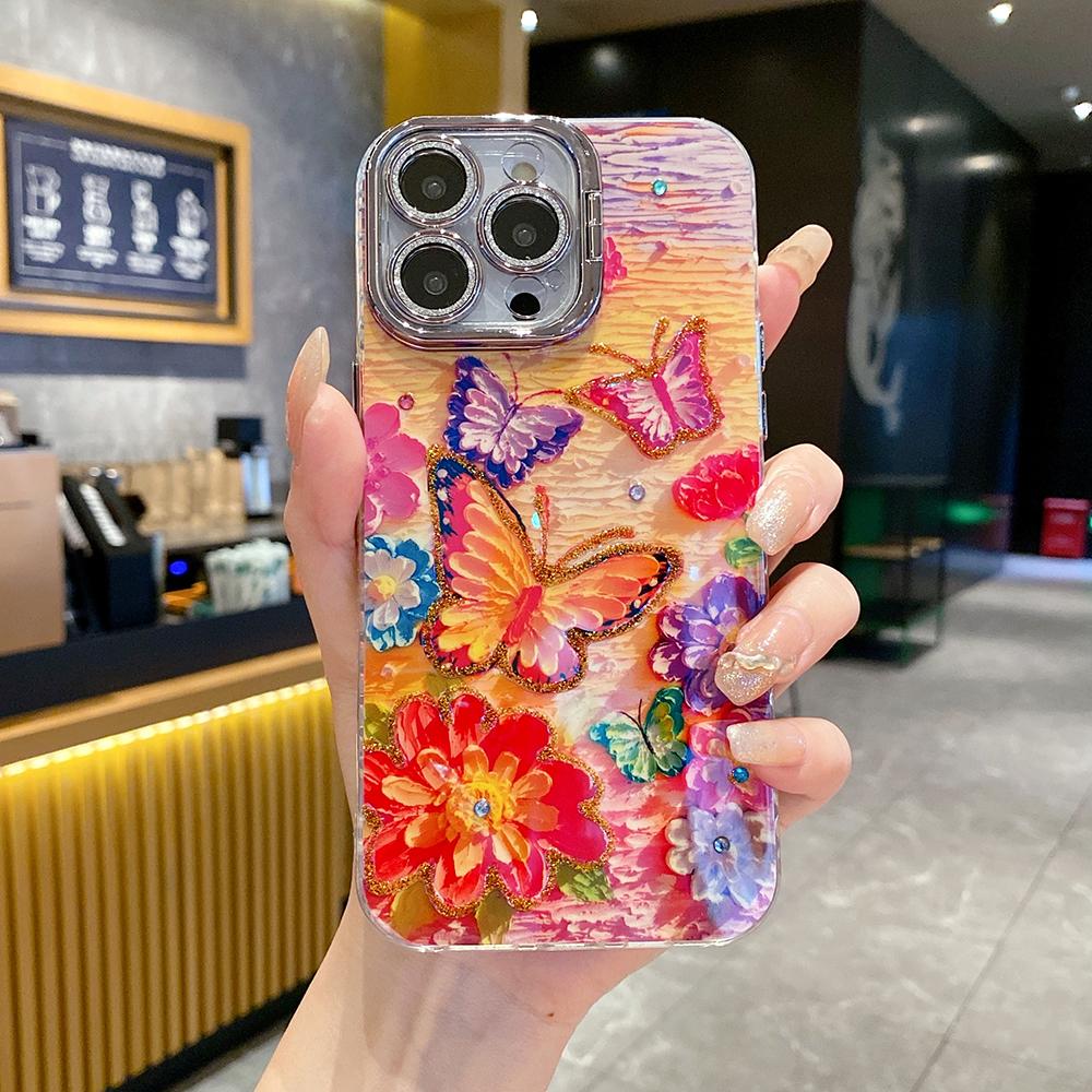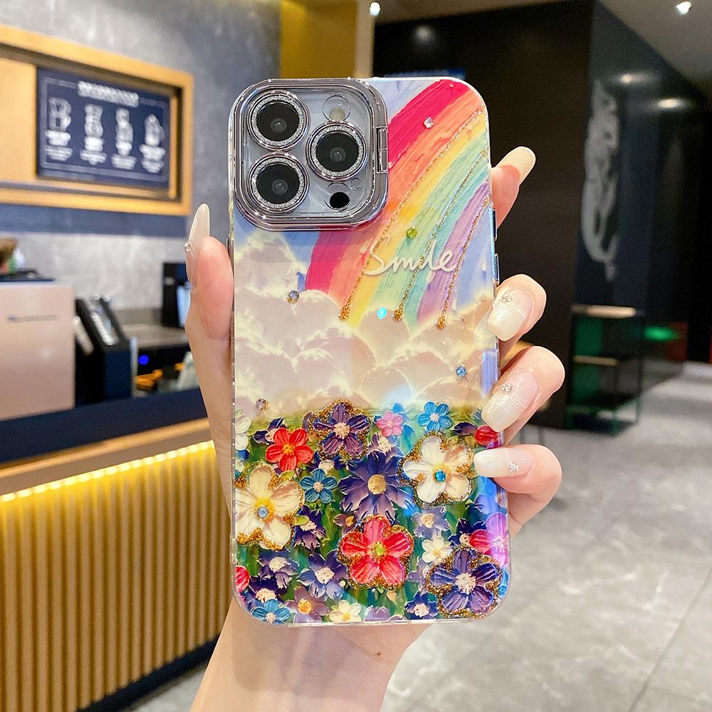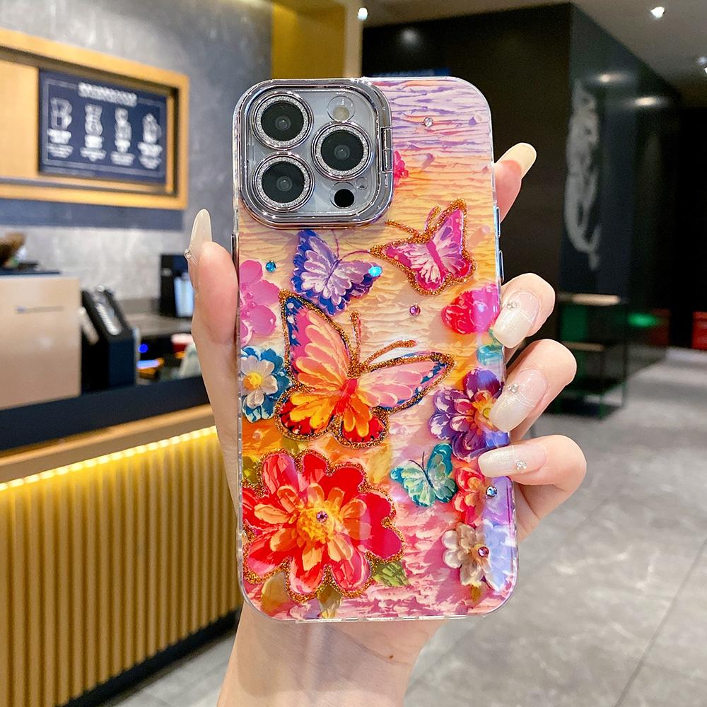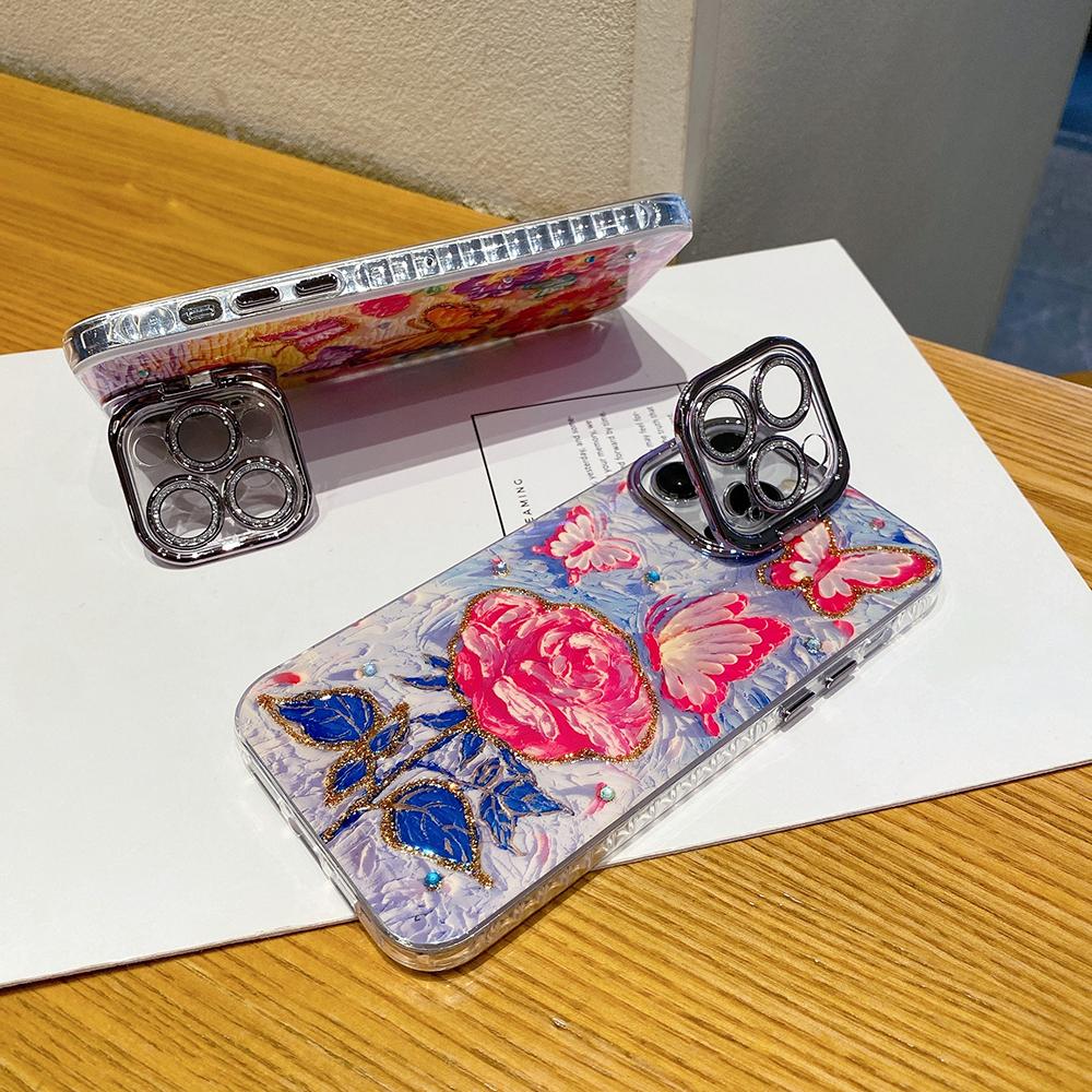 For iPhone 16ProMax 16 15 14 13 12 11 Phone Case with Diamond Camera Kickstand, Rainbow Flower Rose Butterfly, Oil Painting Camera Frame Anti-drop Hard Shockproof Full Cover