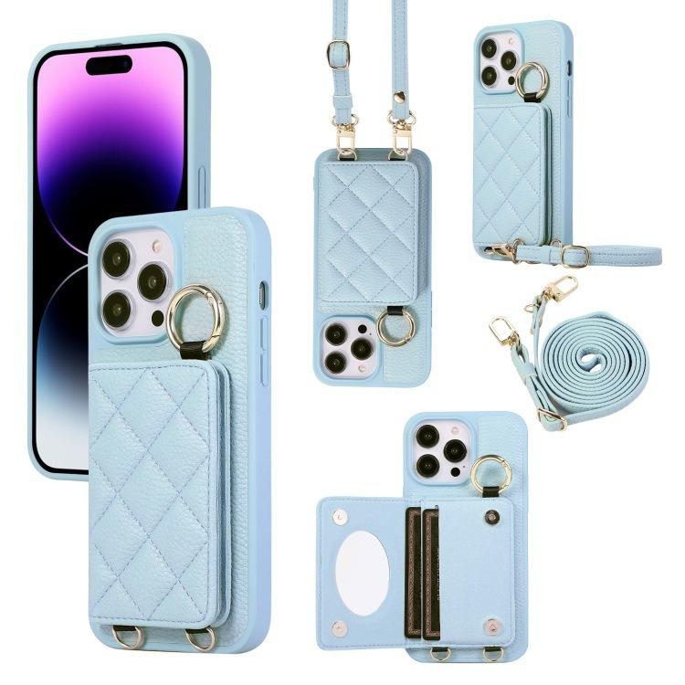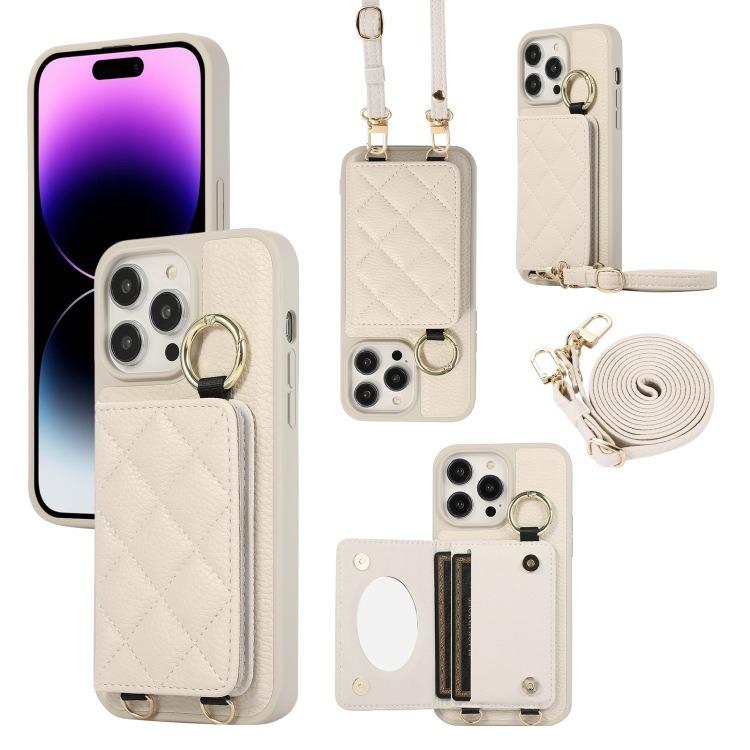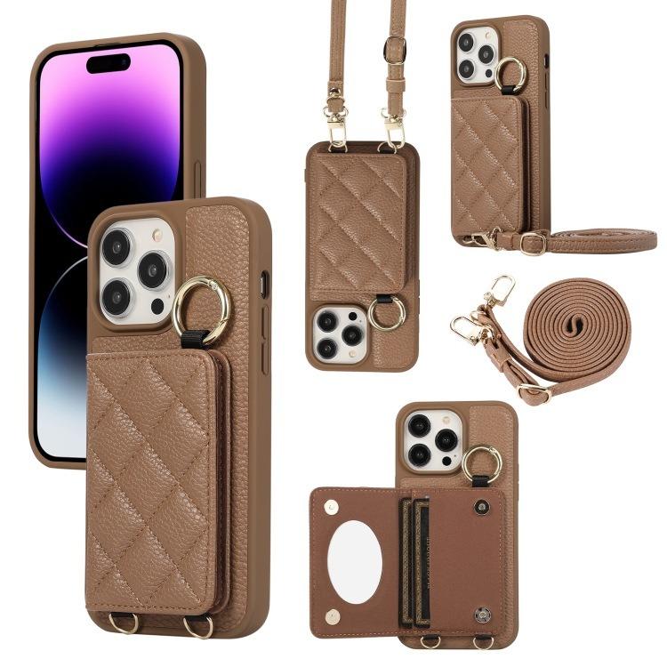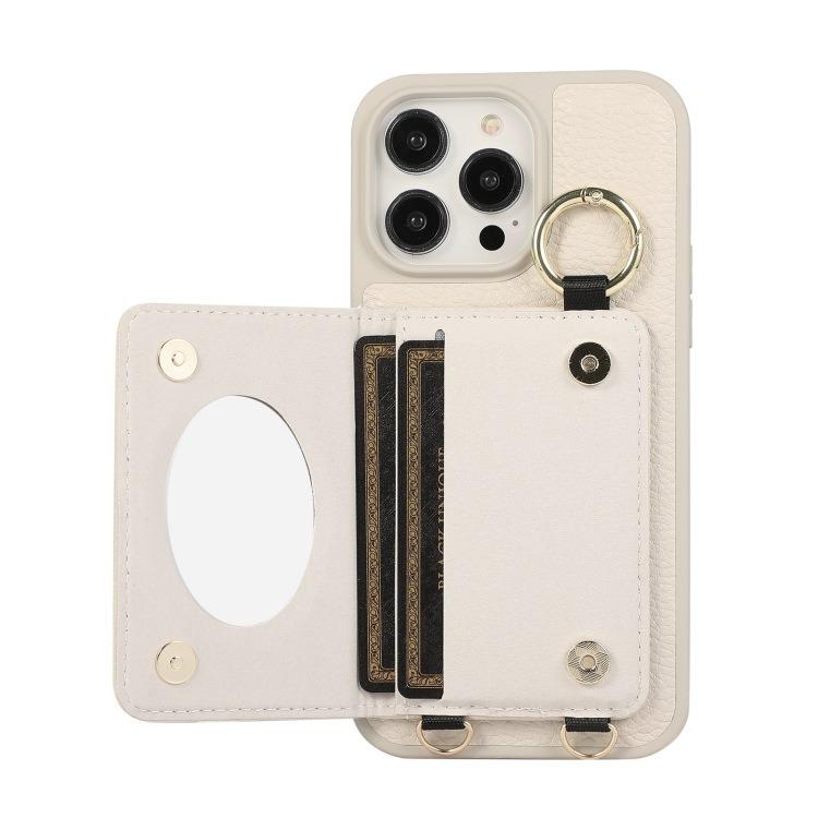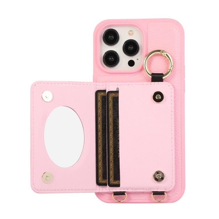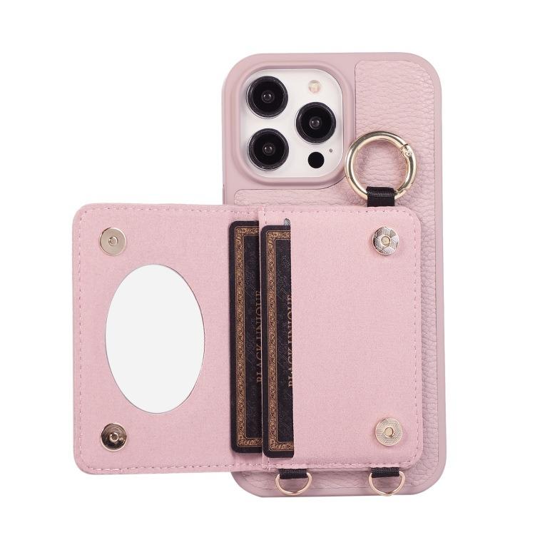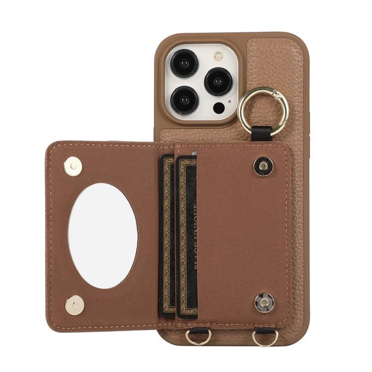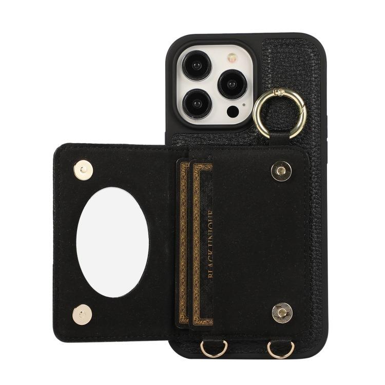 For iPhone 16ProMax 16 15 14 13 12 11 Leather Phone Case with Double Folding Wallet Lanyard, Anti-Fall Card Slot Mirror Ring Kickstand Shockproof Business Hard Full Cover