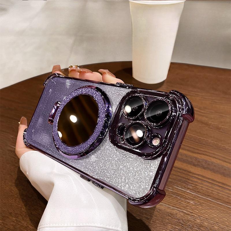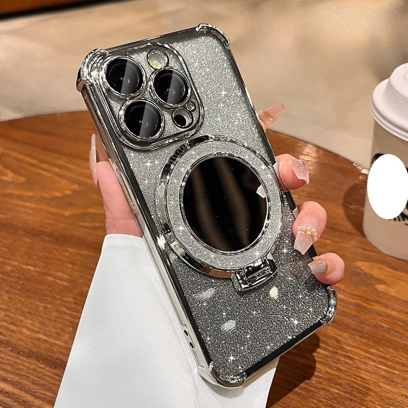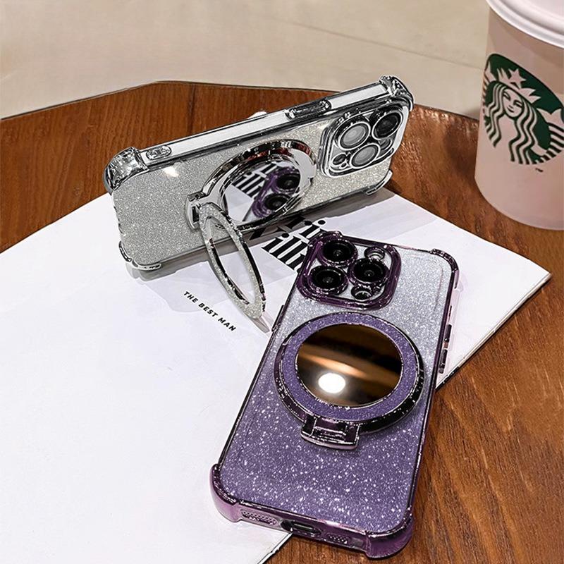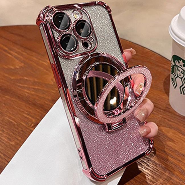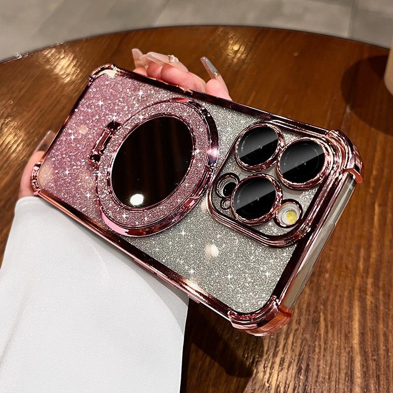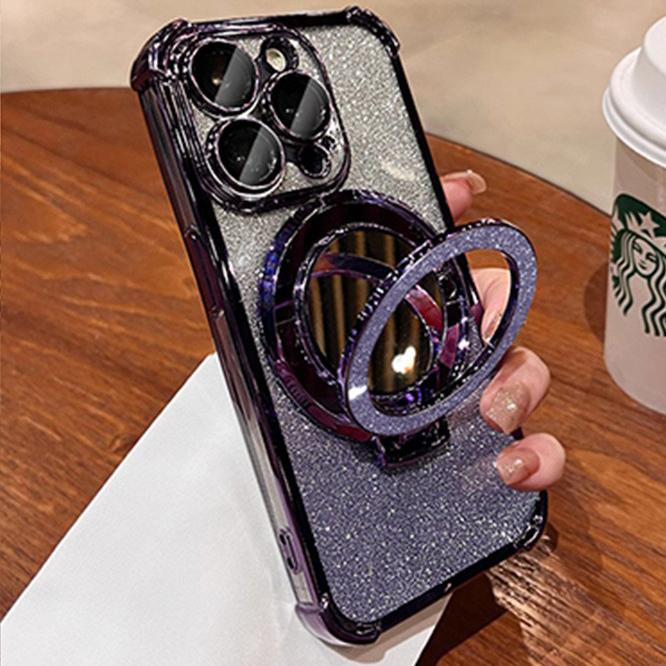 Glitter Gradient Plating Acrylic with Len Protector Phone Case with Mirror Kickstand For iPhone 16ProMax 15 14 13 12 Four Corner Shockproof Hard Full Cover