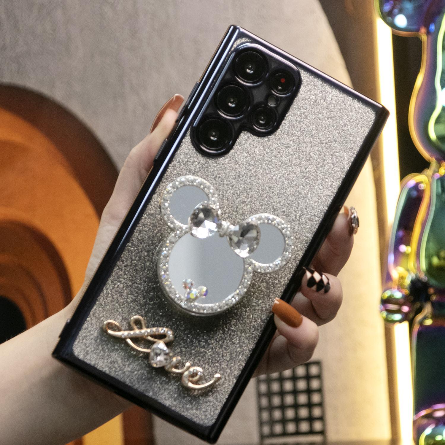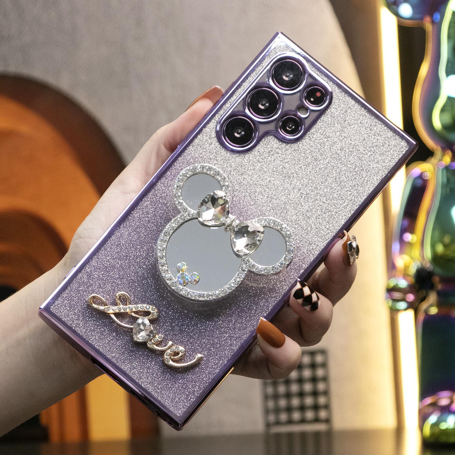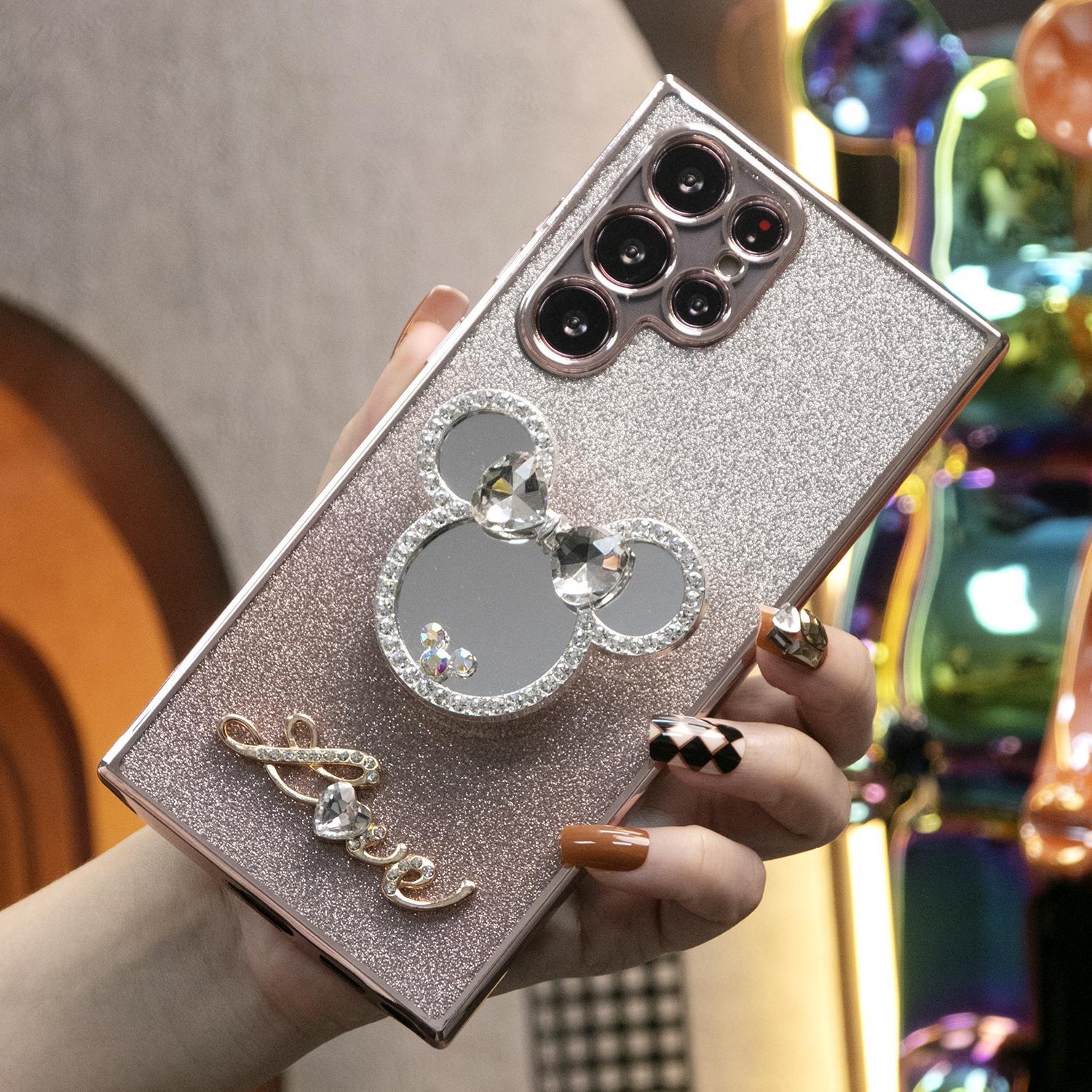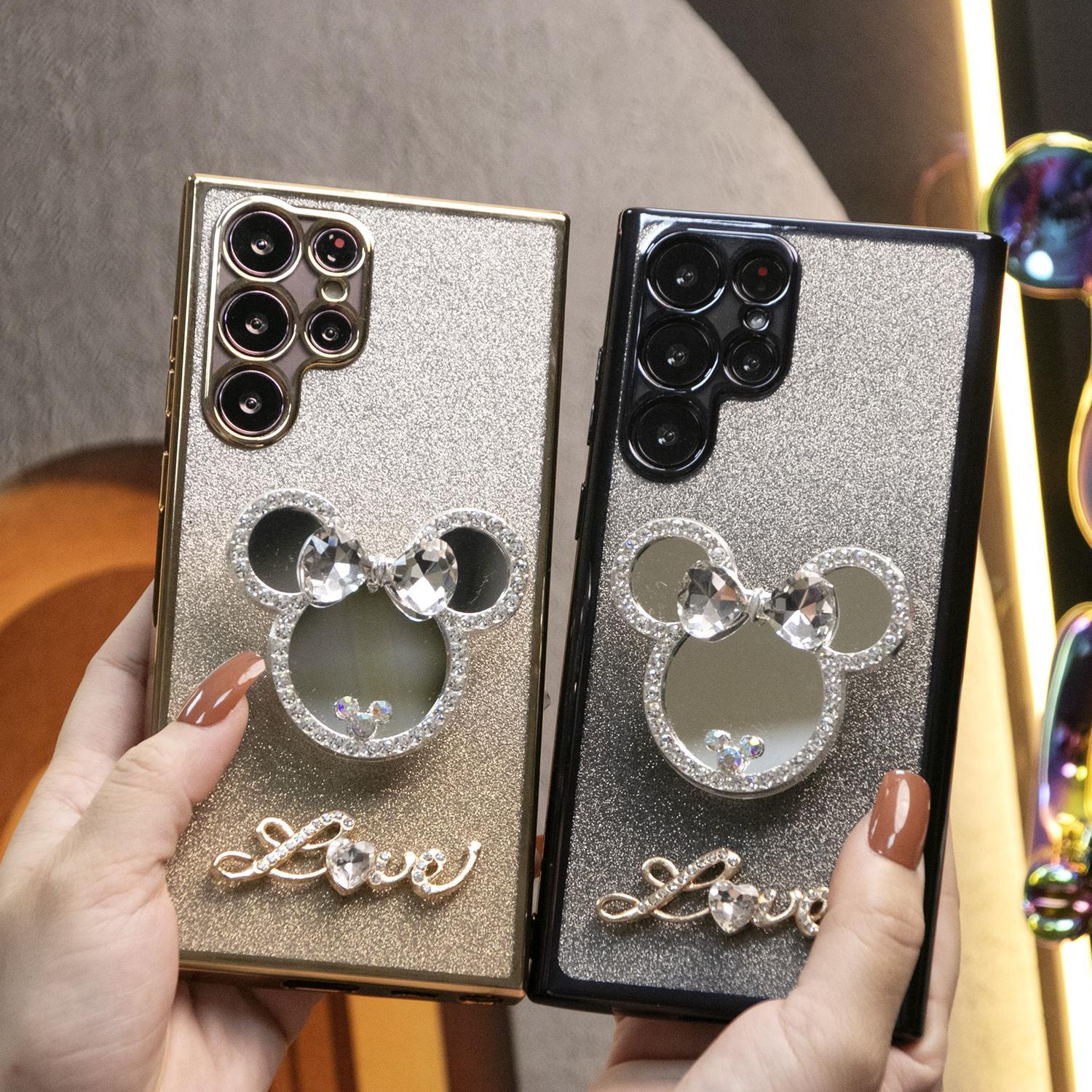 Luxury Diamond Mouse Head Mirror Stand Glitter Clear Gradient TPU Plating Shockproof Soft Phone Case For Samsung S24FE S24Ultra S24 S23 S22 S21 FE Plus Ultra