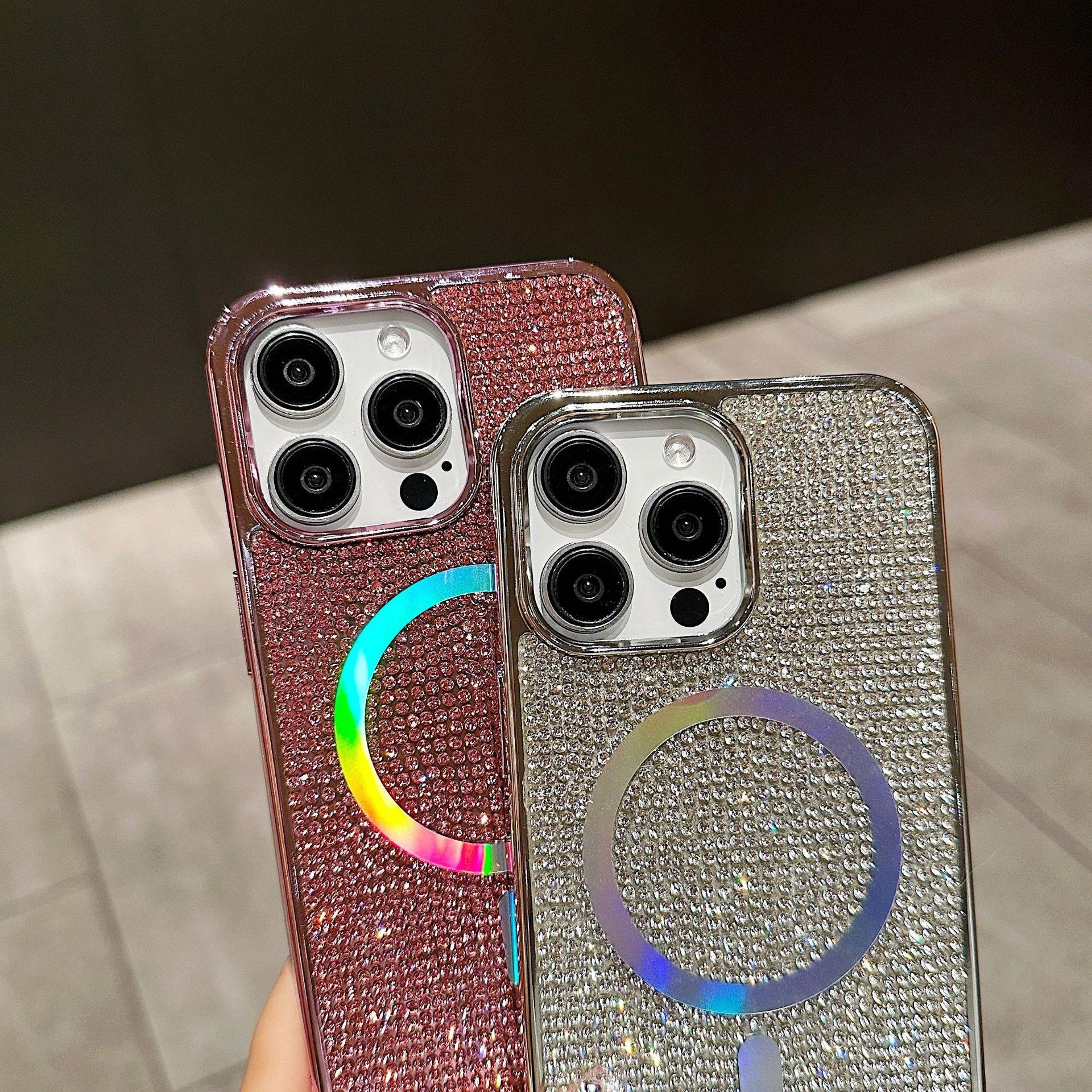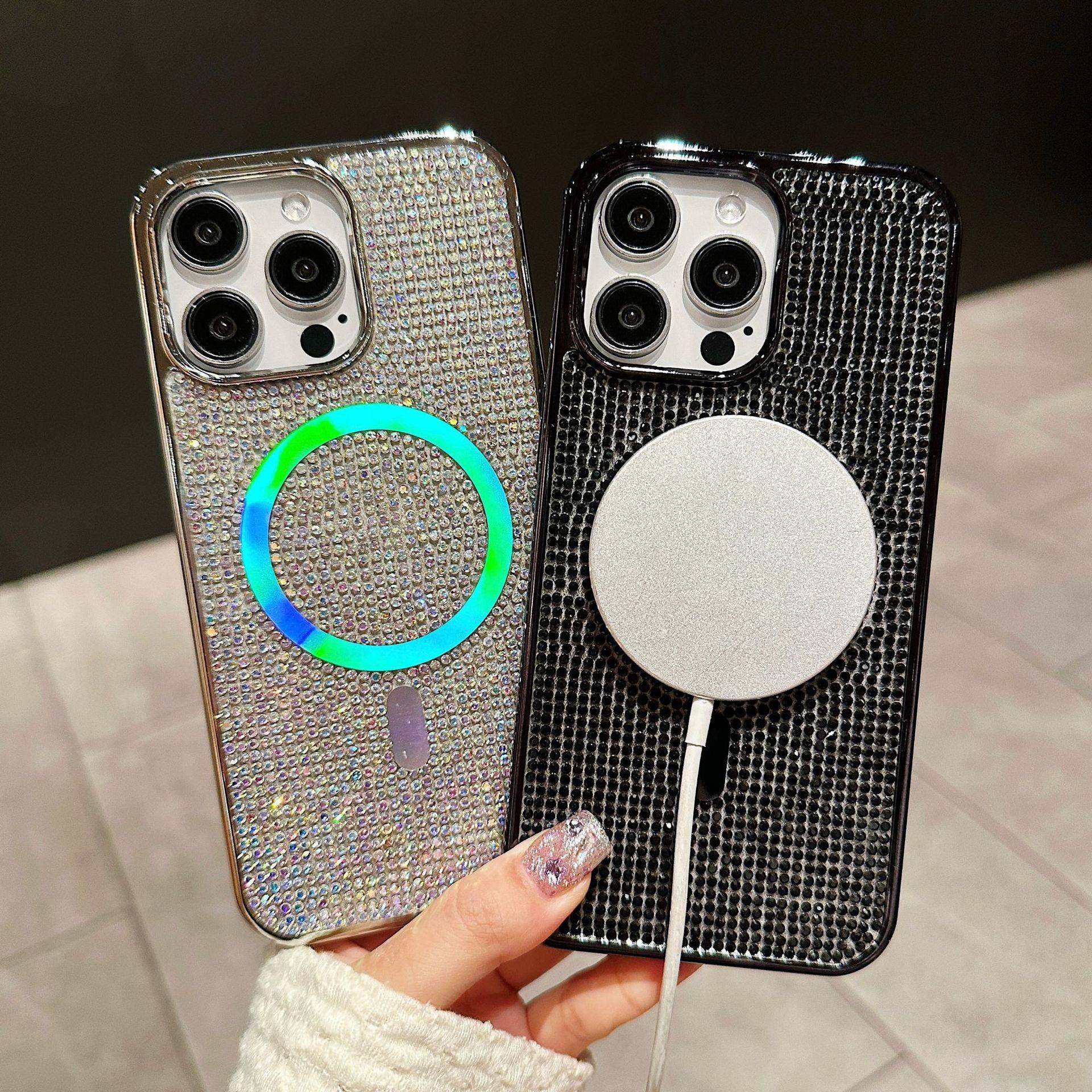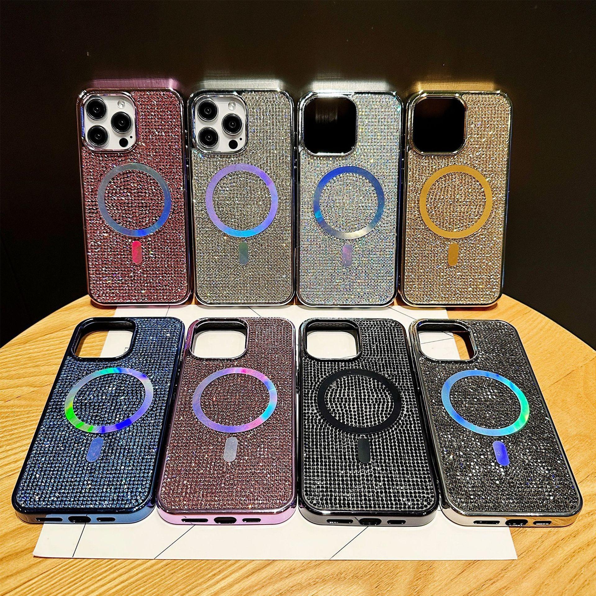 Luxury Rhinestone Glitter Plating Slim PC Strong Magnetic Phone Case For iPhone 16ProMax 15 14 13 Hard Support Wireless Charging Full Cover