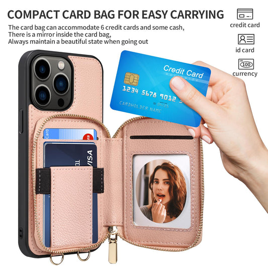 Zipper Crossbody Wallet Phone Case for iPhone 15 14 Plus 13 Pro Max Mirror Metal Chain Lanyard Card Slot Holder Leather Cover