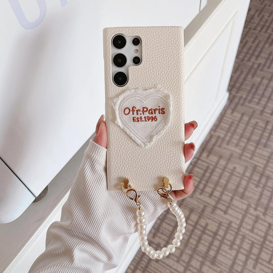 Luxury Leather Love Heart Wrist Strap Pearl Case For Samsung S24 S23 Ultra S23FE S22 Plus A54 A34 A24 A14 A53 A33 A13 A25 A22 Jewel Cover
