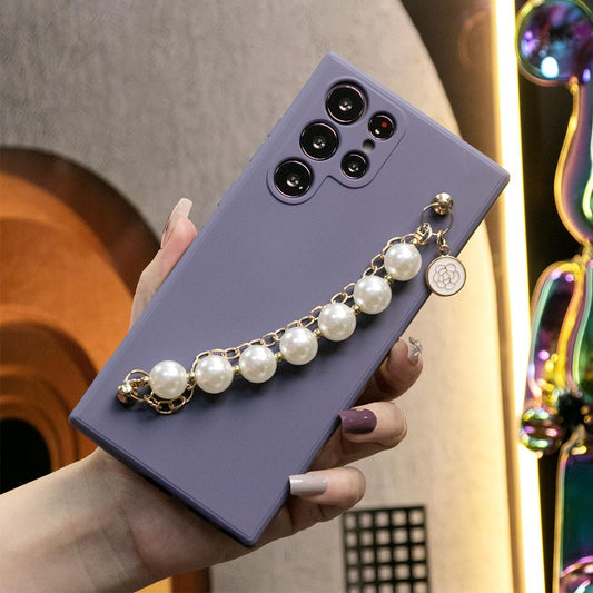 Silicone Matte Phone Case With Pearl Double Chain For Samsung S24 S23 S22 S21 Ultra Plus S24Plus S24Ultra Camera Protect Soft Cover S23 FE