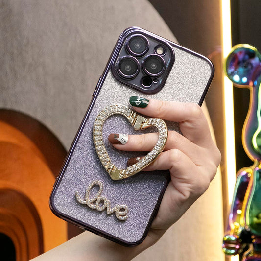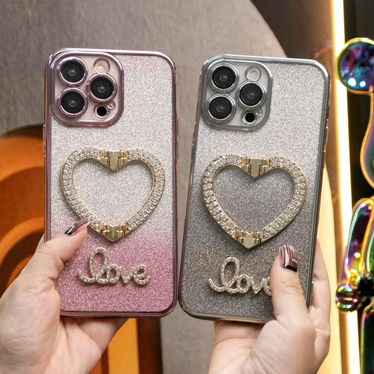 Glitter Transparent Gradient Diamond Love Heart Holder Plating Phone Case For iPhone 16 15 14 13 12 Pro Max Clear Soft TPU Back Cover