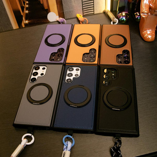 Luxury Full Leather Phone Case With Adjustable Woven Wristband For Magsafe Samsung S24 Ultra S23 S22 Ultra Plus Magnetic Rotate Metal Holder Stand Back Cover