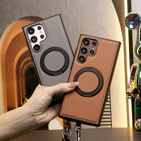 Luxury Full Leather Phone Case For Magsafe Samsung S24 Ultra S23 S22 Ultra Plus Magnetic Rotate Metal Holder Stand Back Cover
