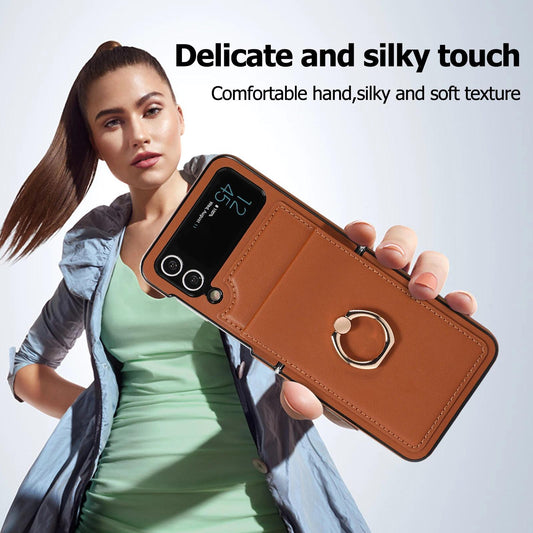 Luxury for Galaxy Z Flip3 4 5 6 Phone Case with Ring Holder Leather Kicstand Stockproof Protective Lightweihgt Thin Cover