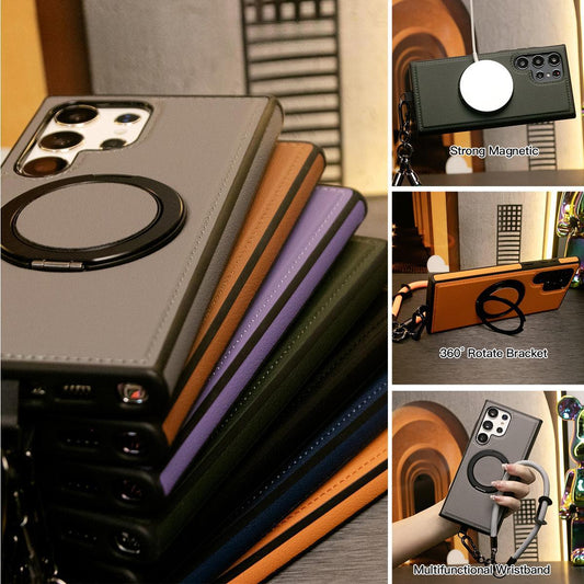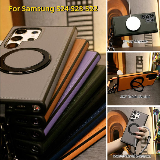 Luxury Full Leather Phone Case With Short Wristband For Magsafe Samsung S24 Ultra S23 S22 Ultra Plus Magnetic Rotate Metal Holder Stand Back Cover