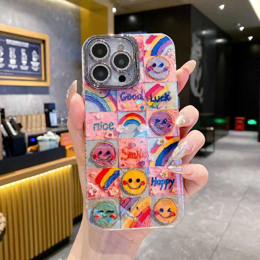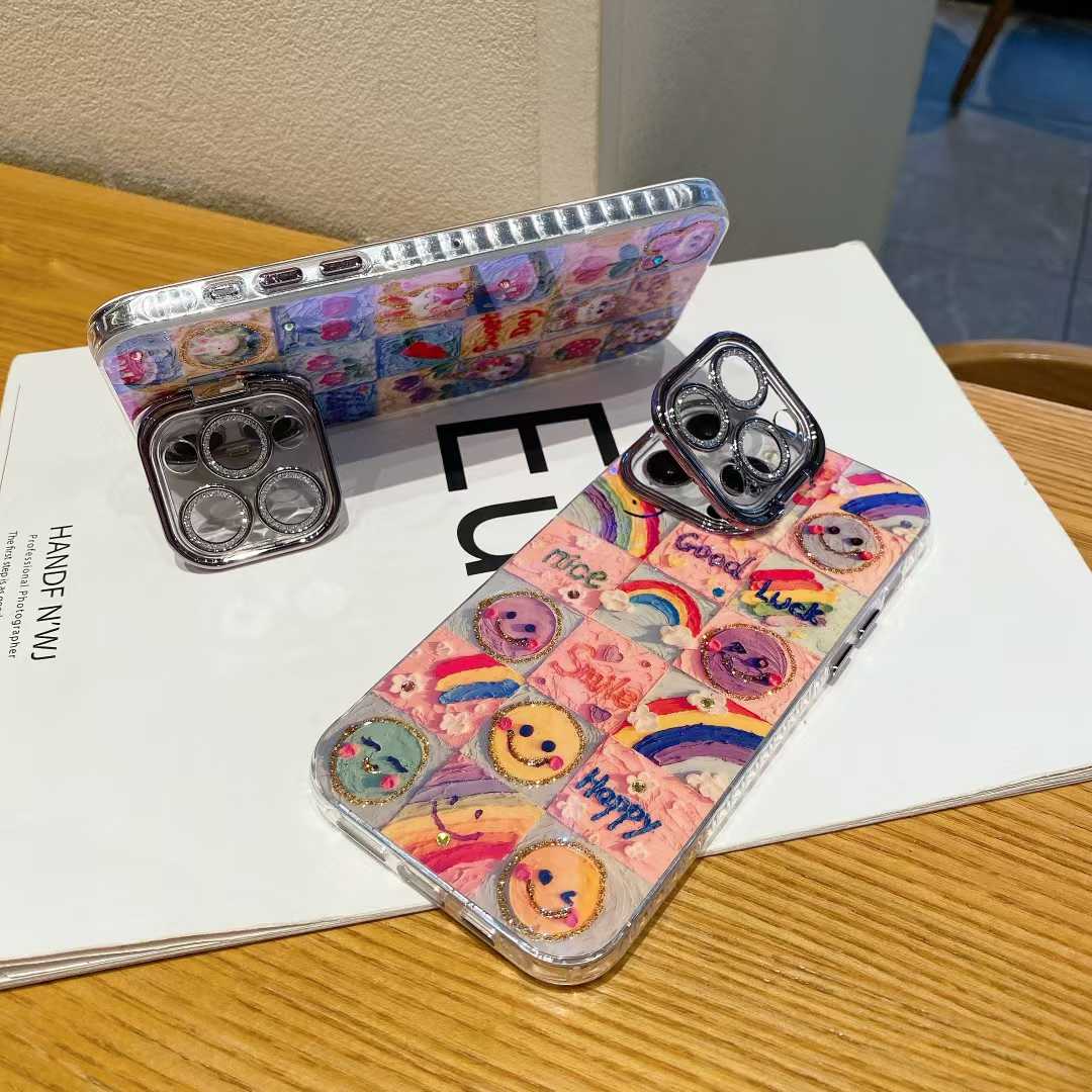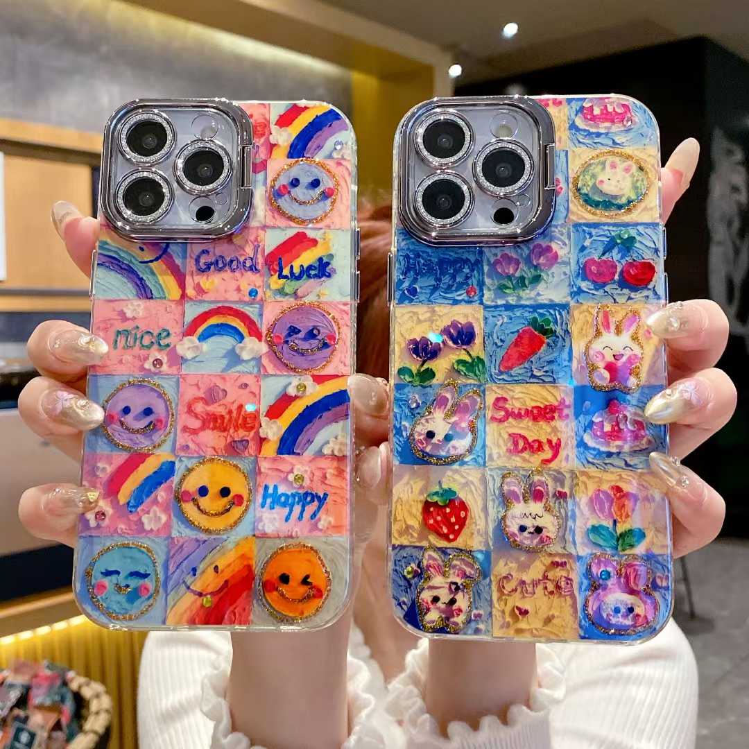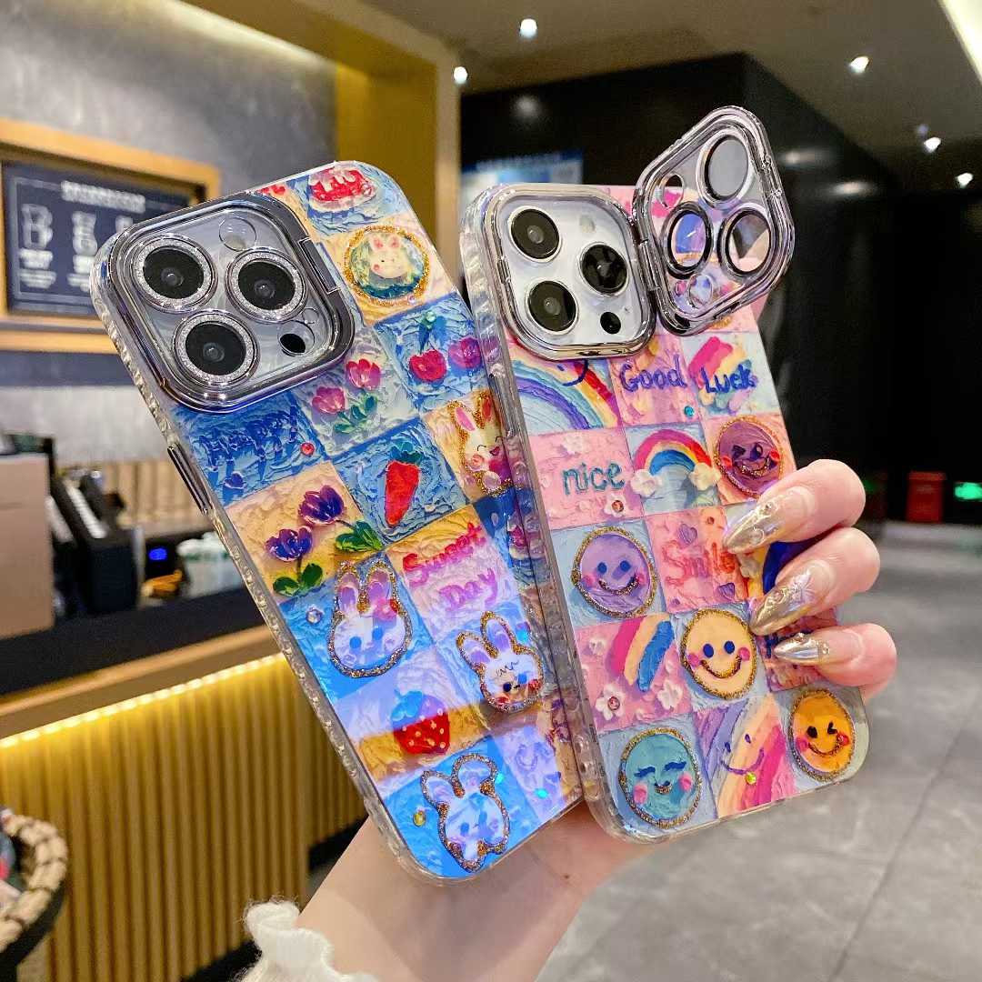 For iPhone 16ProMax 16 15 14 13 12 11 Phone Case with Diamond Camera Kickstand, Smiling Face Rainbow Rabbit Deer, Luxury Oil Painting Camera Frame Anti-drop Hard Shockproof Full Cover