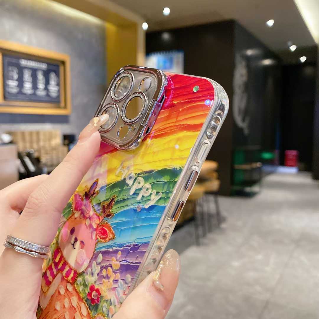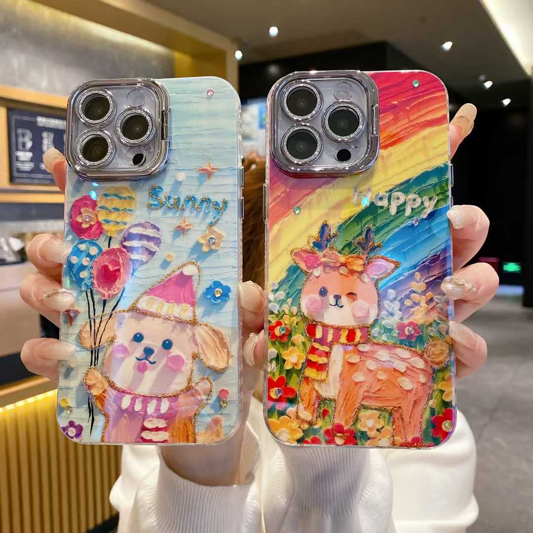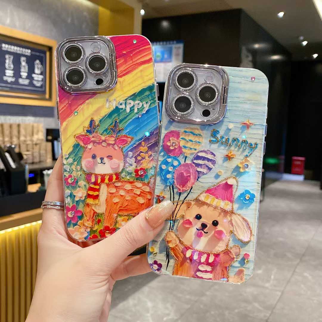 For iPhone 16ProMax 16 15 14 13 12 11 Phone Case with Diamond Camera Kickstand, Smiling Face Rainbow Rabbit Deer, Luxury Oil Painting Camera Frame Anti-drop Hard Shockproof Full Cover