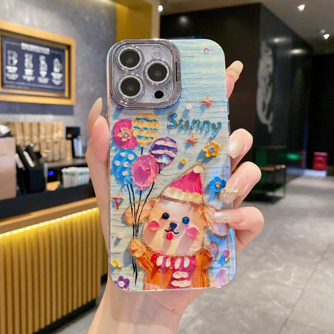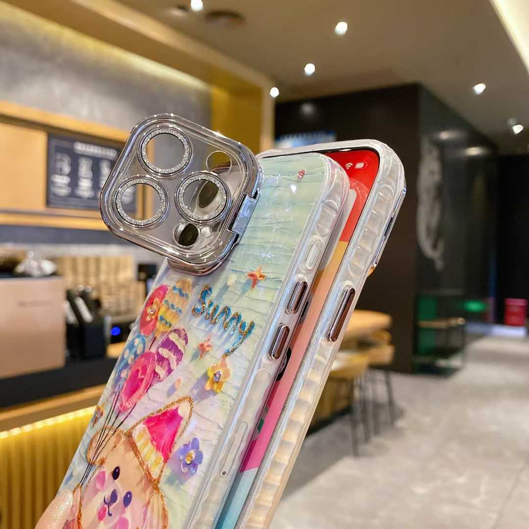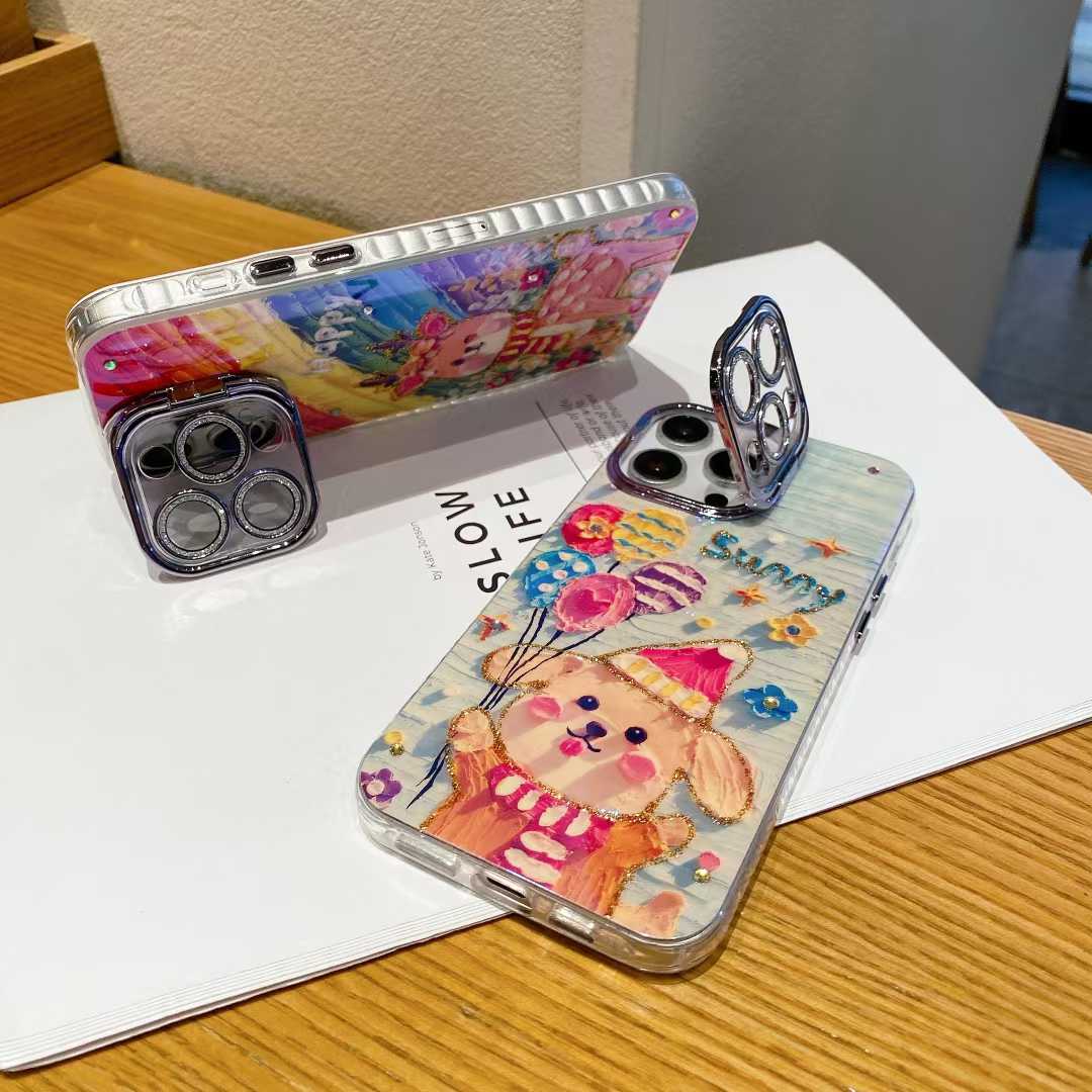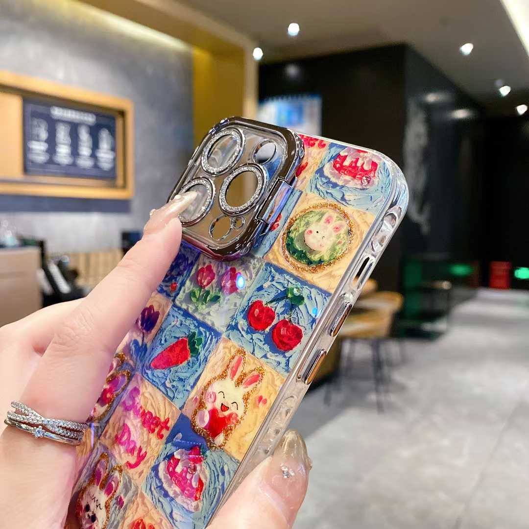 For iPhone 16ProMax 16 15 14 13 12 11 Phone Case with Diamond Camera Kickstand, Smiling Face Rainbow Rabbit Deer, Luxury Oil Painting Camera Frame Anti-drop Hard Shockproof Full Cover