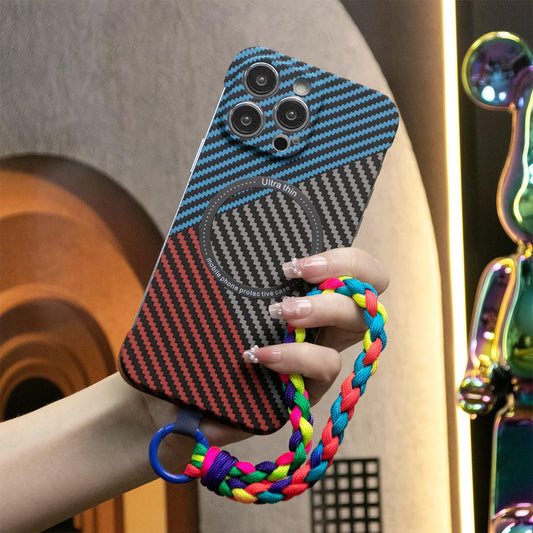 Rimless Carbon Fiber Magnetic Wireless Charging Phone Case With Woven Wristband For iPhone 16 15 14 13 12 Pro Max