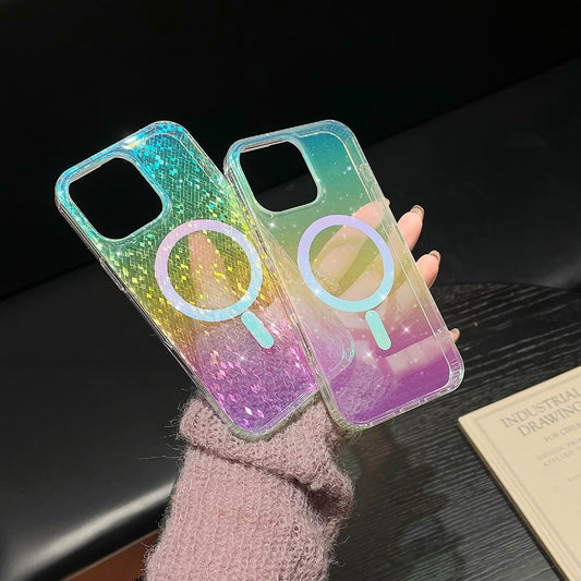 Colorful Laser Magnetic Bracket Large Hole Phone Case For iPhone 16 15 14 13 12 Pro Max MagSafe Sparkling Color Back Cover