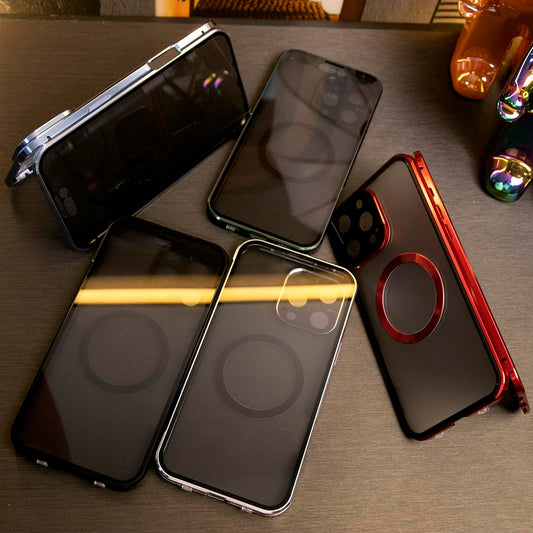 Double Sided Privacy Glass Matte Back Cover Aluminium Alloy For Magsafe Full Cover 360 Magnetic Ring Anti-peep Metal Case For iPhone 16ProMax 16 15 14 13 12 Pro Max Glass Full Cover