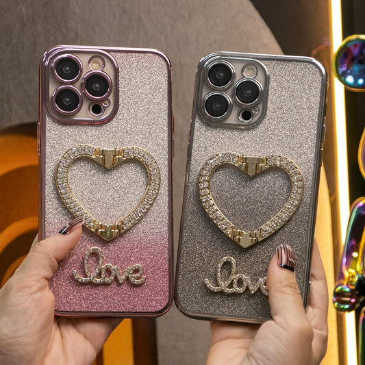 For iPhone 16 15 14 13 Pro Max Phone Case, Clear Gradient Glitter Love Heart Kickstand TPU Luxury Plating Slim Soft Full Cover