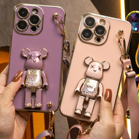 For iPhone 16 15 14 13 Pro Max Phone Case with Lanyard, Candy Bear Kickstand TPU Luxury Plating Slim Soft Full Cover