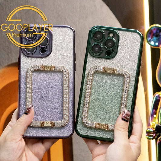 For iPhone 16 15 14 13 Pro Max Phone Case, Clear Gradient Glitter Square Kickstand TPU Luxury Plating Slim Soft Full Cover