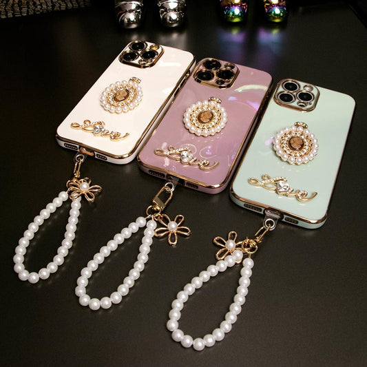 For iPhone 16 15 14 13 Pro Max Phone Case with Pearl Wristband, Pearl Perfume Bottle TPU Luxury Plating Slim Soft Full Cover